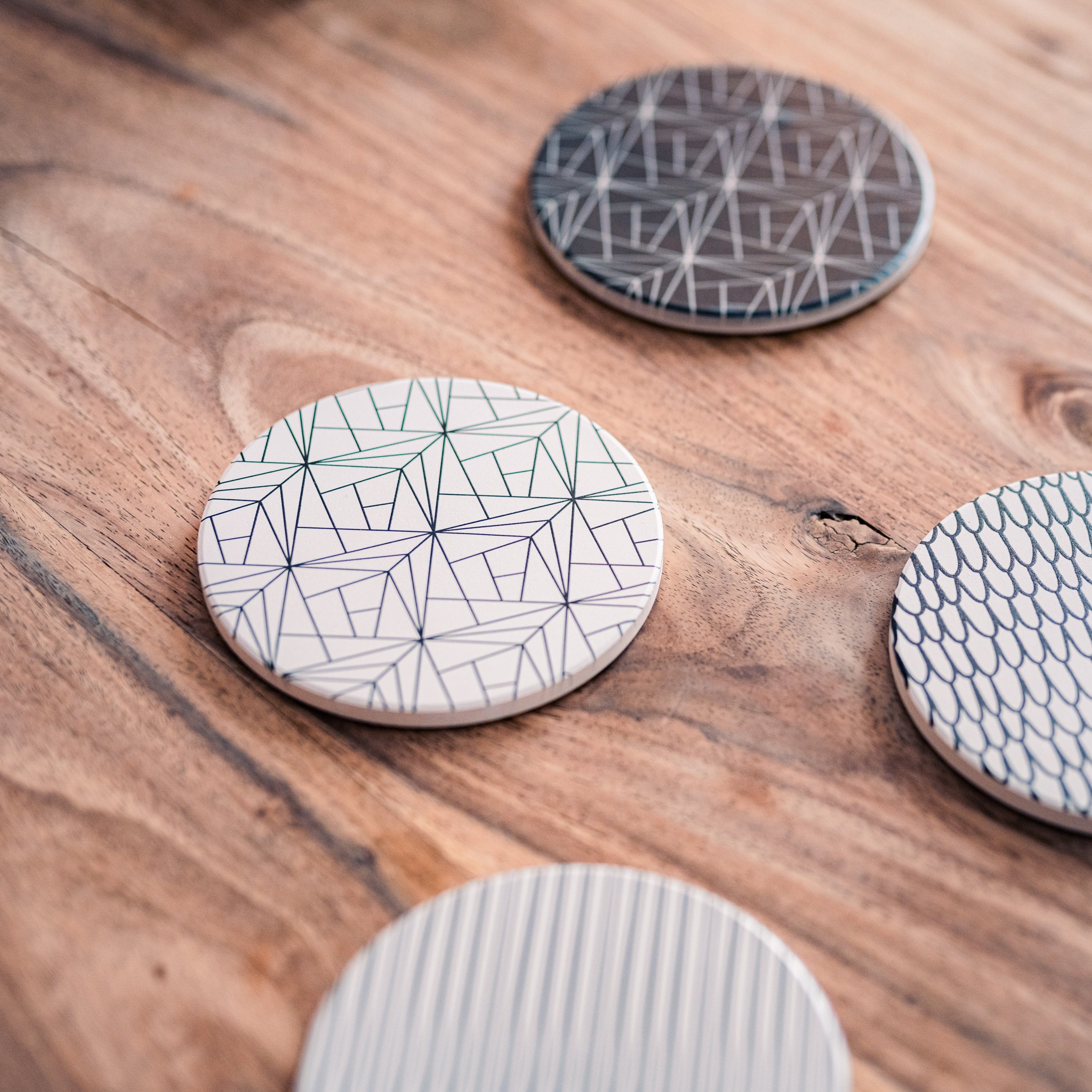Die Untersetzer sind aus hochsaugfähigem Keramikstein und nehmen Flüssigkeiten super schnell auf. Heißer Kaffee, kalte Getränke - egal, dein Tisch bleibt trocken! Unten ist ne Kork-Schicht, damit nix verrutscht und der Tisch nicht zerkratzt wird.