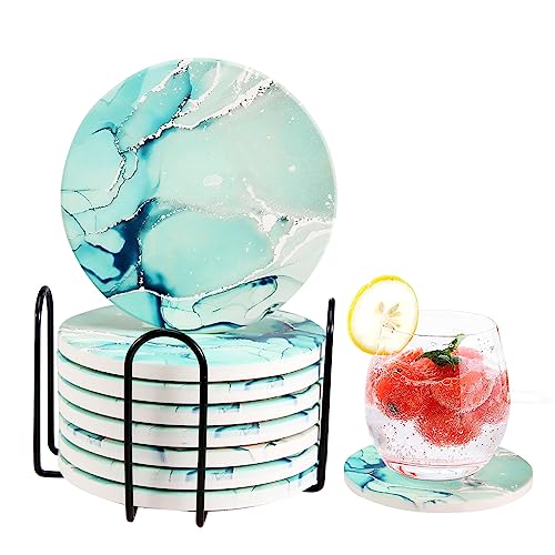 BRILLIRARE Keramik-Untersetzer Set - 6x Marmor-Design Untersetzer Mit Metallhalter, 10cm