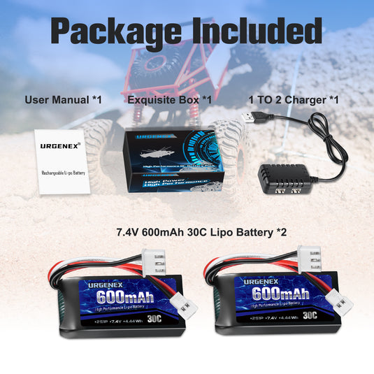 Hey RC-Fans! Diese URGENEX Akkus geben deinem FCX24 Atlas RC Auto richtig Power! 7.4V und 600mAh Kapazität - damit fährt dein Auto länger und schneller. Im 2er-Pack inklusive USB-Lader der beide Akkus gleichzeitig laden kann. Mit 30C Entladerate für hohe Performance. Maße: 48x22x13mm - passen perfekt in dein RC-Fahrzeug. Einfach anstecken und losdüsen! Keine Memory-Effekt - kannst du jederzeit nachladen. Mach dein RC-Abenteuer noch spannender mit dieser zuverlässigen Power-Quelle!