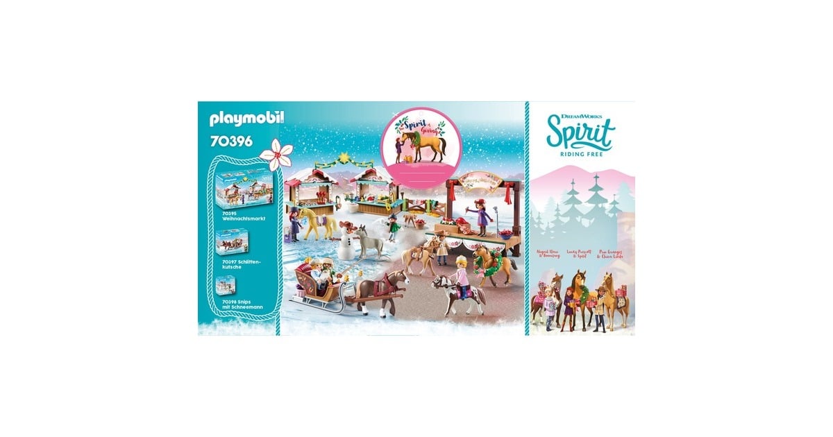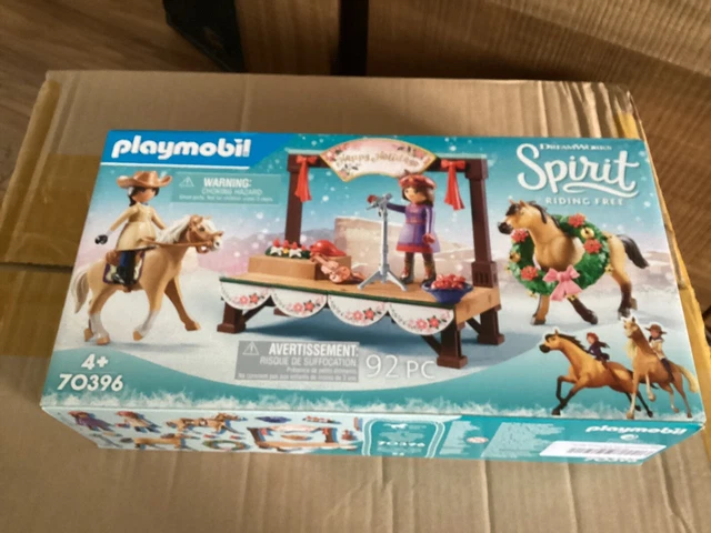 Weihnachtszauber mit Spirit! Dieses 92-teilige PLAYMOBIL-Set bringt die beliebten Charaktere Lucky, Pru und ihre Pferde Spirit und Boomerang in weihnachtliche Stimmung. Die Mädchen bereiten sich auf das große Weihnachtskonzert vor - mit Bühne, Mikrofon und Geige wird musiziert was das Zeug hält. Die Figuren haben abnehmbare Kopfbedeckungen und weiche Röcke, sodass sie super auf den Pferden sitzen können. Made in Europe und für Kinder ab 4 Jahren geeignet, ist das Set robust und sicher. Die vielen Accessoires wie Lebkuchen, Geschenke und festliche Dekoration laden zu fantasievollen Spielstunden ein. Perfekt als Weihnachtsgeschenk oder für alle kleinen Spirit-Fans! Einfach aufbauen und losspielen - der Weihnachtsspaß kann beginnen!