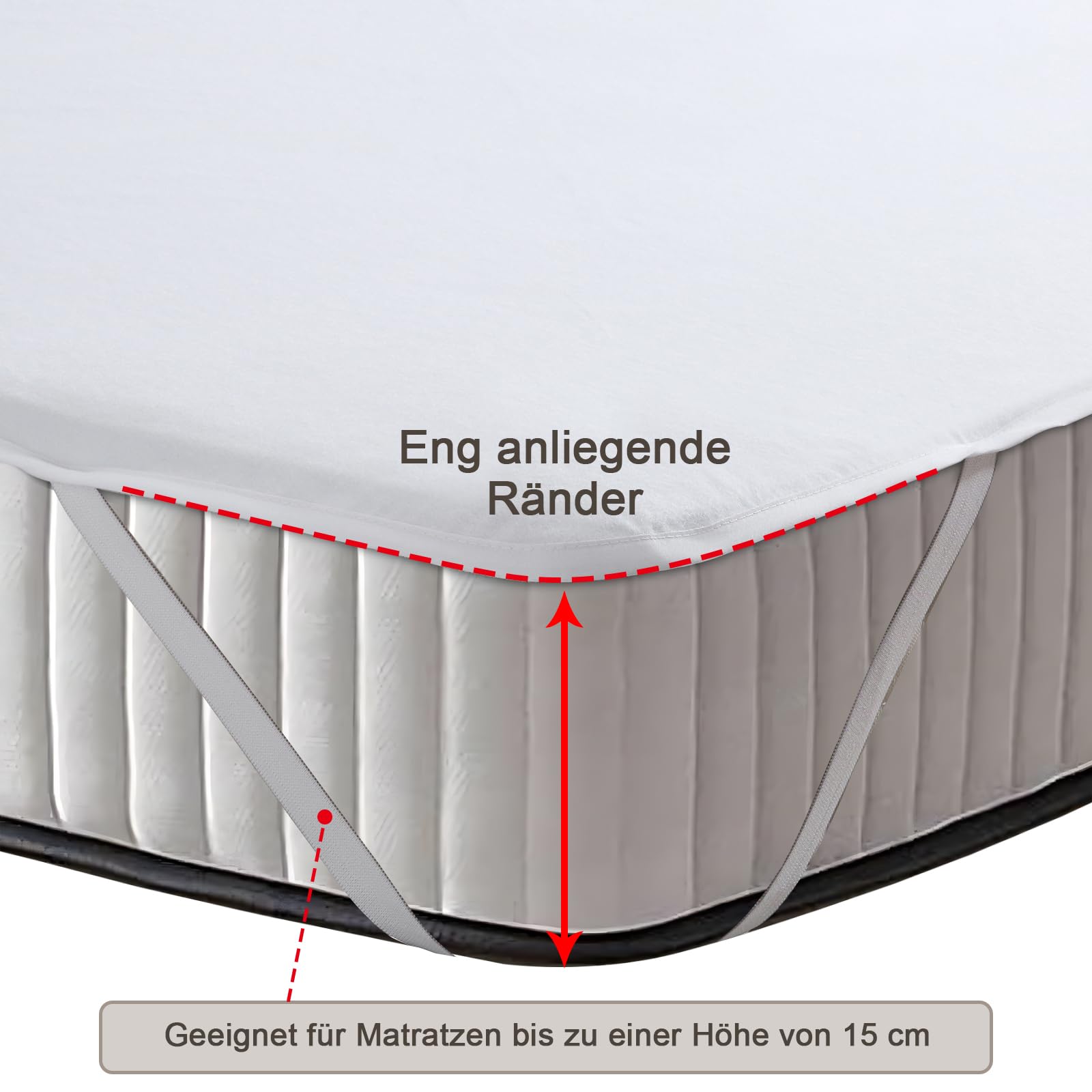 Die 4 Eckgummis halten den Schoner sicher auf Matratzen bis 30cm Dicke fest - er verrutscht nicht und bleibt immer an der richtigen Stelle. Und bei 60°C waschbar wird er auch nach mehrmaligem Waschen wieder hygienisch sauber.
