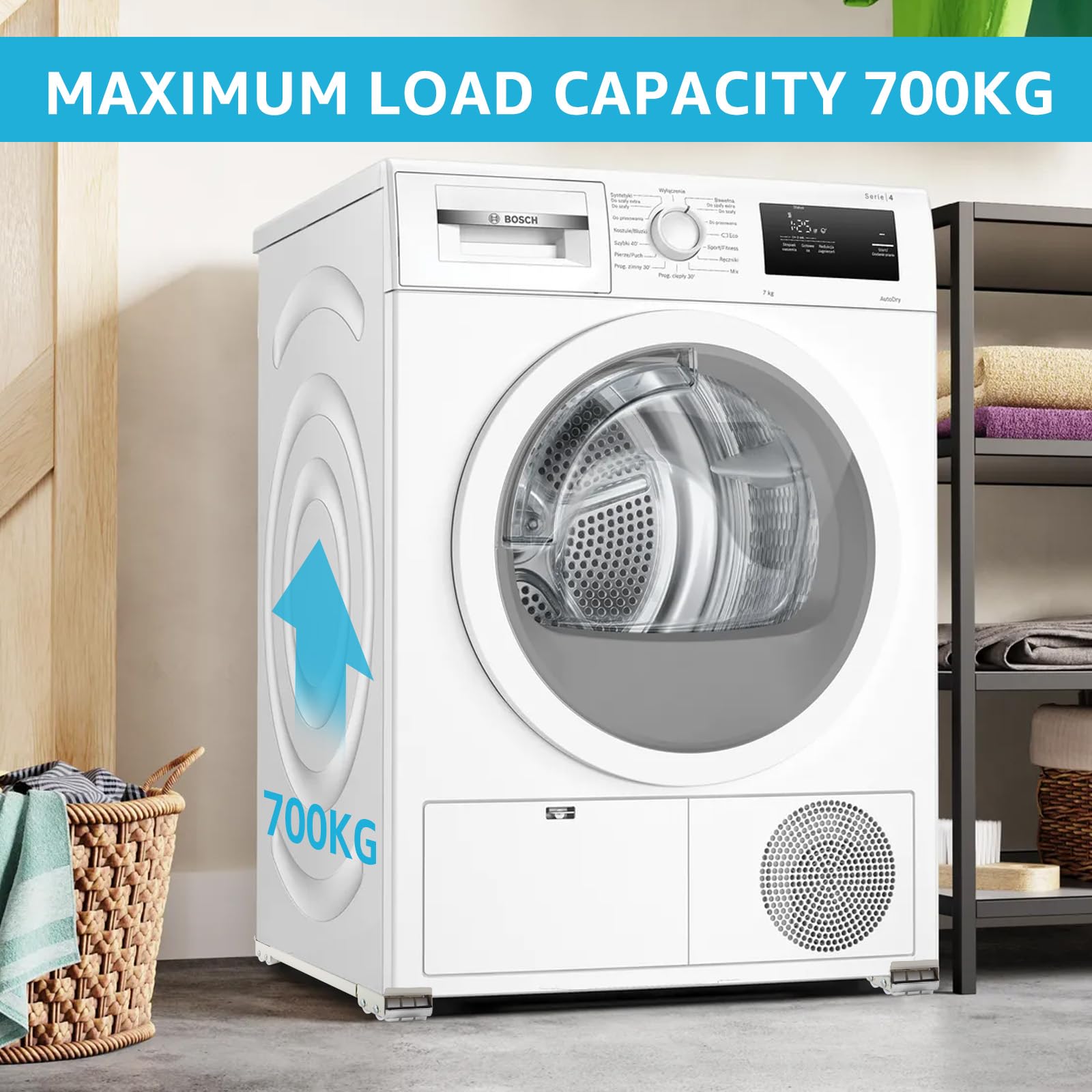 Endlich leichter bewegen! Dieses Untergestell macht das Verschieben von Waschmaschine, Trockner oder Kühlschrank zum Kinderspiel. Verstellbar von 45-72cm, passt also an die meisten Geräte. Unglaubliche 300kg Tragkraft - da kannst du wirklich alles draufstellen. Mit 18 Rädern die sich in alle Richtungen drehen lassen. Anti-Rutsch-Gummi sorgt für sicheren Stand. Schutzpads schonen deinen Boden vor Kratzern. Werkzeuglose Montage - einfach zusammenschieben und fertig. Super praktisch zum Reinigen oder Umstellen. Auch für schwere Klimaanlagen geeignet. In weiß, passt zu jeder Küche oder Waschküche.