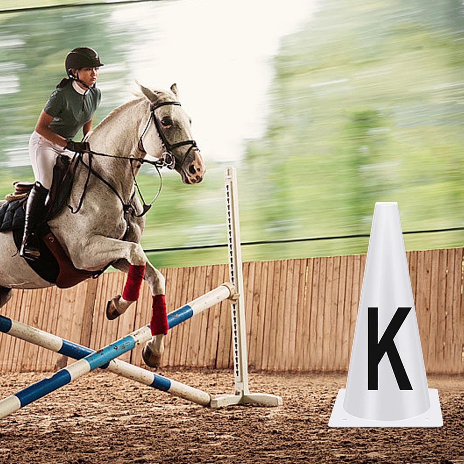Für alle Reiter und Pferdefreunde! Dieses 8-teilige Dressurkegel-Set ist perfekt für das Training auf dem Reitplatz. Jeder Kegel ist mit einem anderen Buchstaben bedruckt - A, B, C, E, F, H, K, M - genau wie bei richtigen Dressurprüfungen! Aus leichtem PP-Material gefertigt, sind die Kegel super einfach zu transportieren und aufzustellen. Die weiße Farbe mit schwarzen Buchstaben sorgt für beste Sichtbarkeit, auch aus der Distanz. Besonders praktisch: Die Löcher in den Kegeln ermöglichen es, sie bei Wind auf einer schwereren Basis zu befestigen. So stehen sie sicher und verrutschen nicht. Mit 32 cm Höhe und 16,5 cm Durchmesser sind sie die ideale Größe für das Dressurtraining. Perfekt um die Bewegungspräzision deines Pferdes zu verbessern oder für Reitstunden. Mach dein Training professioneller mit diesen praktischen Kegeln - dein Pferd wird's dir danken!