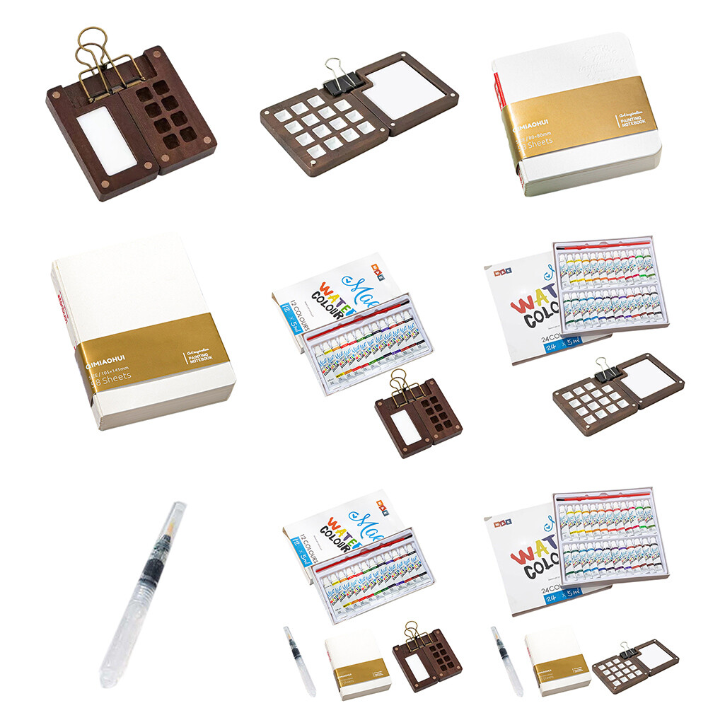 Das Complete-Set enthält alles, was du brauchst: Eine schicke Aquarell-Palette aus Walnuss-Holz mit 8 Farbfächern, ein Aquarell-Skizzenbuch (6x6cm), Metall-Clips und 12 brillante Wasserfarben. Einfach den Pinsel anfeuchten und loslegen!
