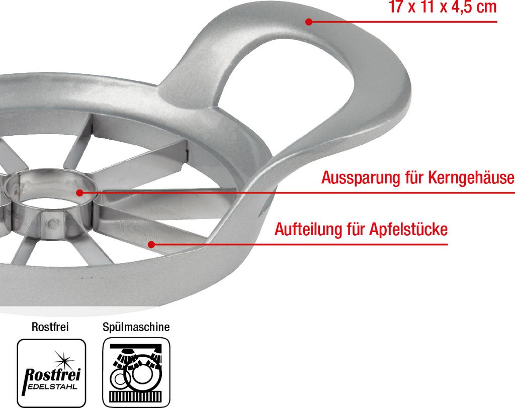 Endlich Schluss mit mühsamem Apfelschneiden! Der Kelomat Apfelteiler aus rostfreiem Edelstahl macht aus jedem Apfel im Handumdrehen 8 gleichmäßige Stücke. Einfach draufdrücken - schon hast du perfekte Apfelspalten ohne Kerngehäuse. Super praktisch für's Frühstück, die Lunchbox oder wenn mal schnell Obst für mehrere Personen geschnitten werden muss. Und das Beste: Die robusten Klingen bleiben ewig scharf und das Teil ist spülmaschinengeeignet. Maße: 22,1 x 10,6 x 1,9 cm. Ein echter Küchenhelfer, der sich jeden Tag bewährt!