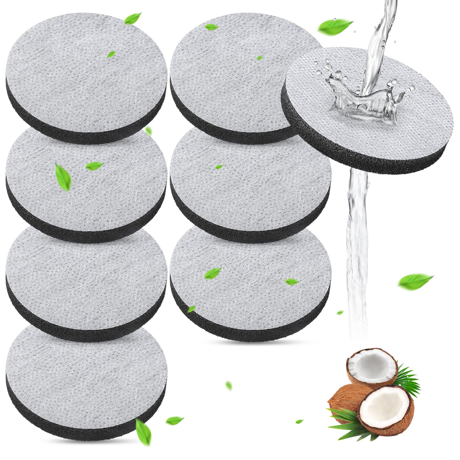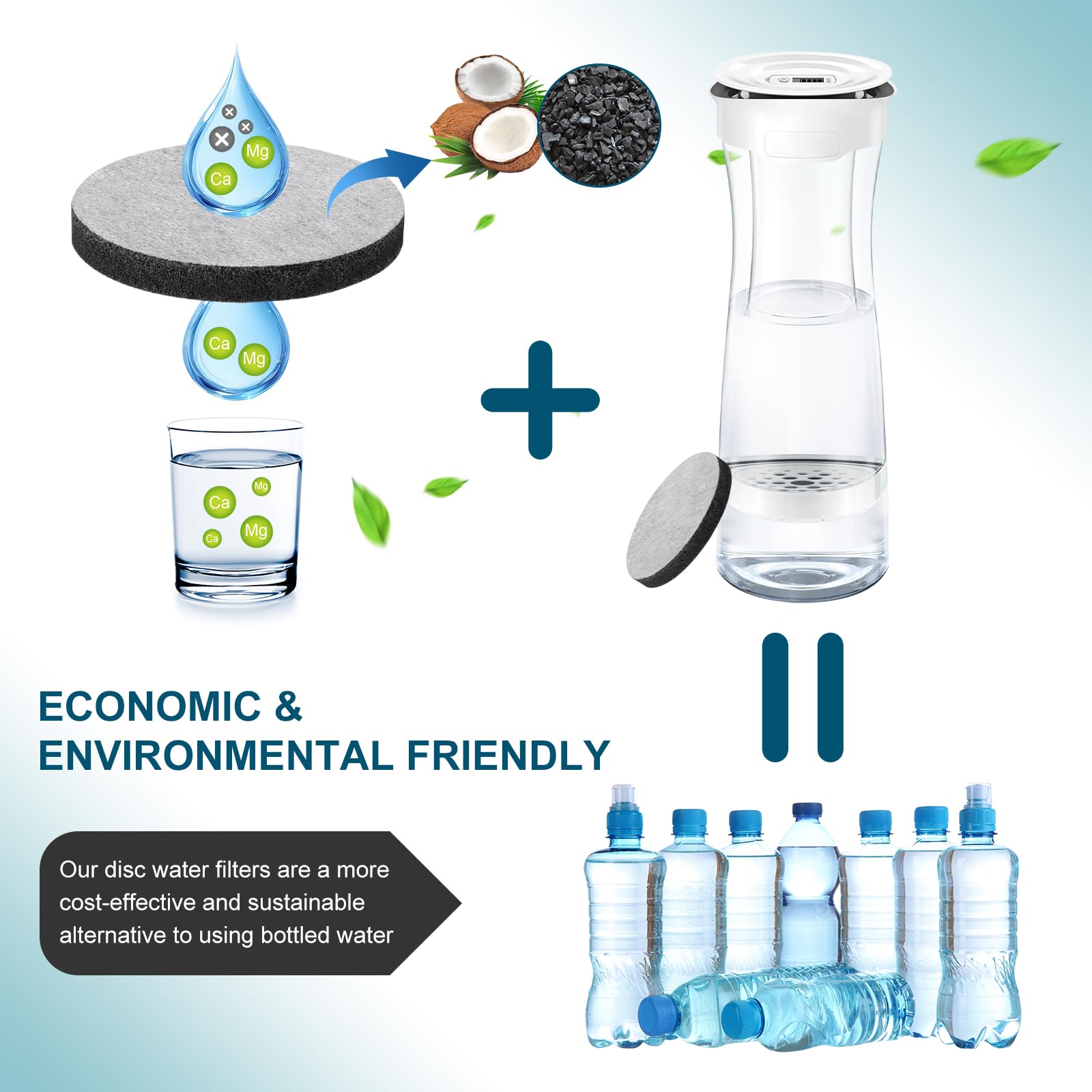 Aus Aktivkohle von Kokosnussschalen gemacht, also komplett natürlich. Jede Scheibe hält bis zu 4 Wochen oder filtert 60 Liter in Flaschen bzw. 150 Liter in Karaffen.
