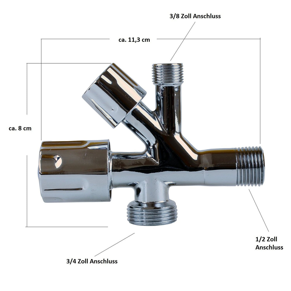 Die Maße passen perfekt: 3/8\ gerader Anschluss für Dreiecksventile und Toiletten-Einläufe, sowie 9/16\ für Sprühgeräte. So kannst du flexibel mehrere Geräte an einer Wasserquelle betreiben.