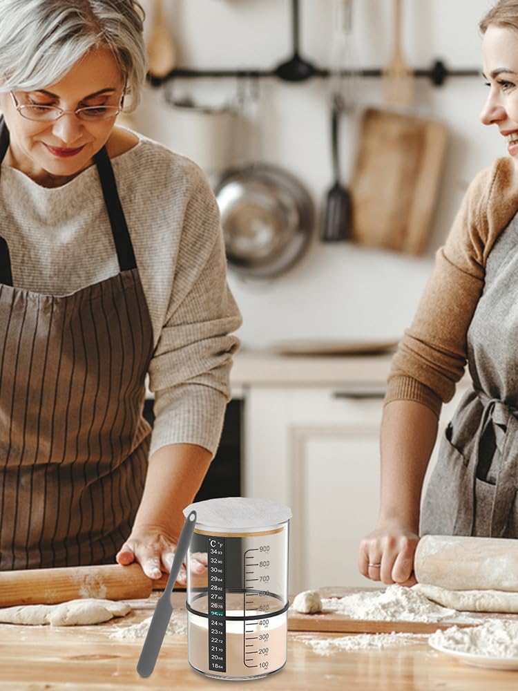 Für alle Brotback-Fans! Dieses komplette 8-teilige Sauerteig Starter Set hat alles was du für die perfekte Gärung brauchst. Das 900ml Glas aus hitzebeständigem Glas (bis 150°C) zeigt dir den Gärfortschritt klar an. Inklusive Holzdeckel für luftdichten Verschluss im Kühlschrank und atmungsaktiver Stoffabdeckung für die Gärphase. Das Thermometer-Papier hilft dir, die Temperatur immer im Blick zu behalten. Mit praktischem Silikonspatel zum Umrühren, Gummiband für sicheren Verschluss, Etiketten und Stift zum Beschriften. Die große Öffnung macht Reinigen und Befüllen super einfach. Perfekt für Sauerteig-Anfänger und Profis gleichermaßen. Wiederverwendbar und spülmaschinenfest - nachhaltige Lösung für deine Backleidenschaft. Hol dir das komplette Set und starte noch heute dein nächstes Brotback-Abenteuer!