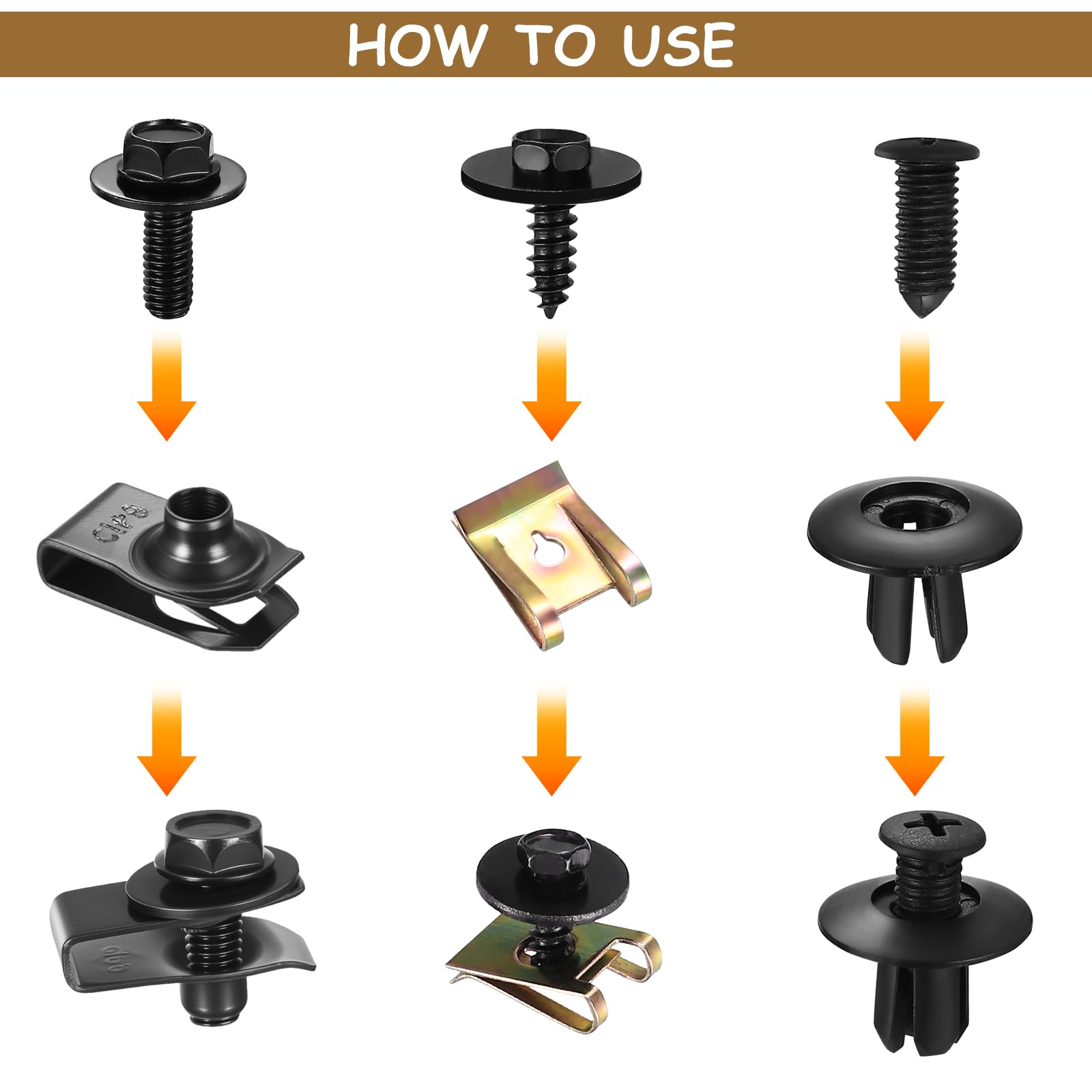 Autoschrauber, dieses 80-teilige Blechmutter Set ist die Rettung für jede Reparatur! Alles dabei, was du so brauchst für Karosserie-Arbeiten! \\n\\nWas genau? 12 Kunststoff-Spreizmuttern, 8 Sechskantschrauben mit U-Blechmuttern, 8 Metallbolzen mit U-Mutterhaltern, 10 flache Hitzeschutzblech-Schrauben, 10 Klemmscheiben für Hitzeschutzbleche und 16 U-Federclips! \\n\\nAlles aus hochwertigem Kohlenstoffstahl und Kunststoff - also rostfrei, oxidationsbeständig und mega stabil! Hält, was es verspricht! \\n\\nEinbau? Simpel! Die Gewinde sind tief und klar geschnitten - also hohe Klemmkraft und nix verrutscht! Selbst für Laien gut zu machen! \\n\\nUnd praktisch: Kommt in ner sortierten Box mit Größenangaben! Alles schön ordentlich, nix geht verloren! Siehst auf einen Blick, was du brauchst! \\n\\nFür Kotflügel, Stoßstangen, Motorhauben, Unterbodenverkleidungen - eigentlich für fast alles am Auto! Auch für Motorräder geeignet! \\n\\nAlso: Immer gut, so ein Set da zu haben! Spart Zeit und Ärger!
