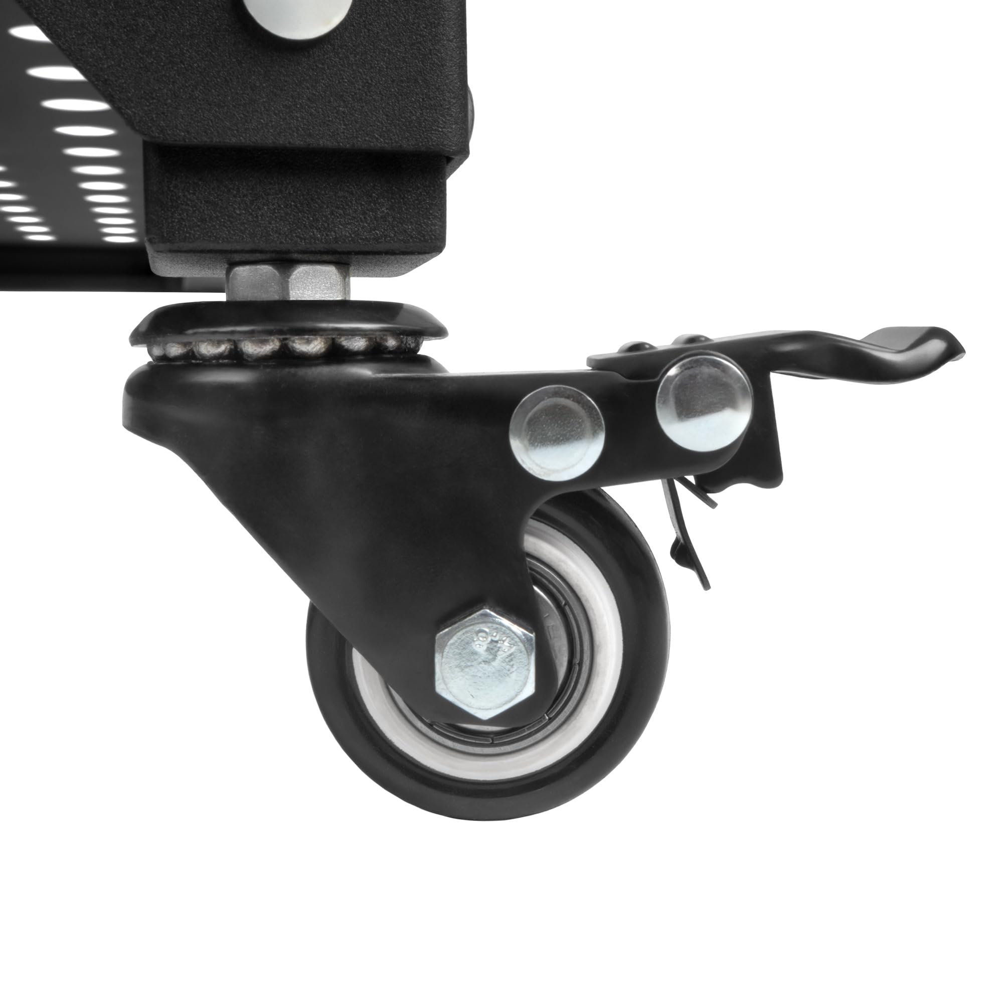 4 Räder mit Feststellbremsen für sicheren Stand. Zwei zusätzliche Ablageflächen für Stauraum. Höhenverstellbare Ebenen für flexible Nutzung.