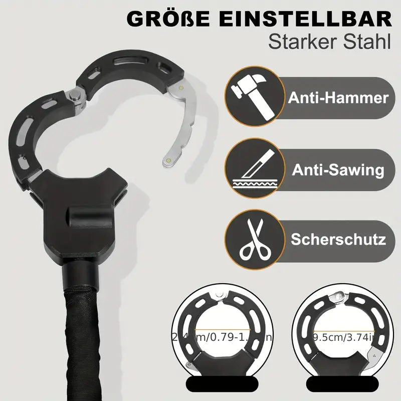 Dein E-Scooter verdient den besten Schutz! Dieses 8mm dicke Schloss aus volllegiertem Stahl macht Dieben das Leben schwer. Mit 90cm Länge passt es super um Laternen, Zäune oder Fahrradständer. Die weiche Gummihülle schützt deinen Scooter vor Kratzern - kein Ärger mehr über lackierte Oberflächen! Das Handschellen-Design ist nicht nur sicher, sondern sieht auch noch richtig cool aus. Einfach mit dem mitgelieferten Schlüssel ver- und entriegeln - simpler geht's nicht. Perfekt für E-Scooter, Fahrräder, E-Bikes oder sogar Motorräder. Mit anti-Schnitt, anti-Bruch und anti-Sägen Eigenschaften kannst du beruhigt dein Gefährt abstellen. Sicherheit muss nicht kompliziert sein!