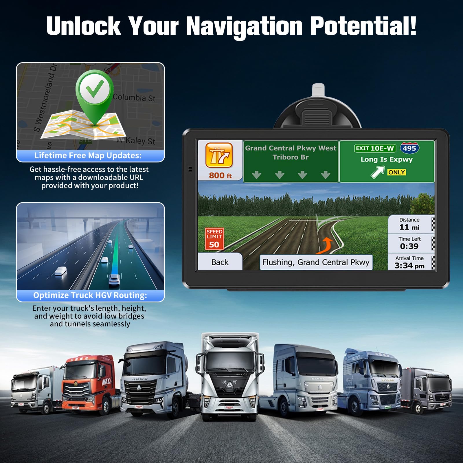 Endlich ein Navi, das wirklich für LKWs gemacht ist! Der 22,9 cm große HD-Bildschirm zeigt alles super klar an. Einfach Fahrzeugdaten eingeben - und schon umgeht es niedrige Brücken und Gewichtsbeschränkungen. Genial!