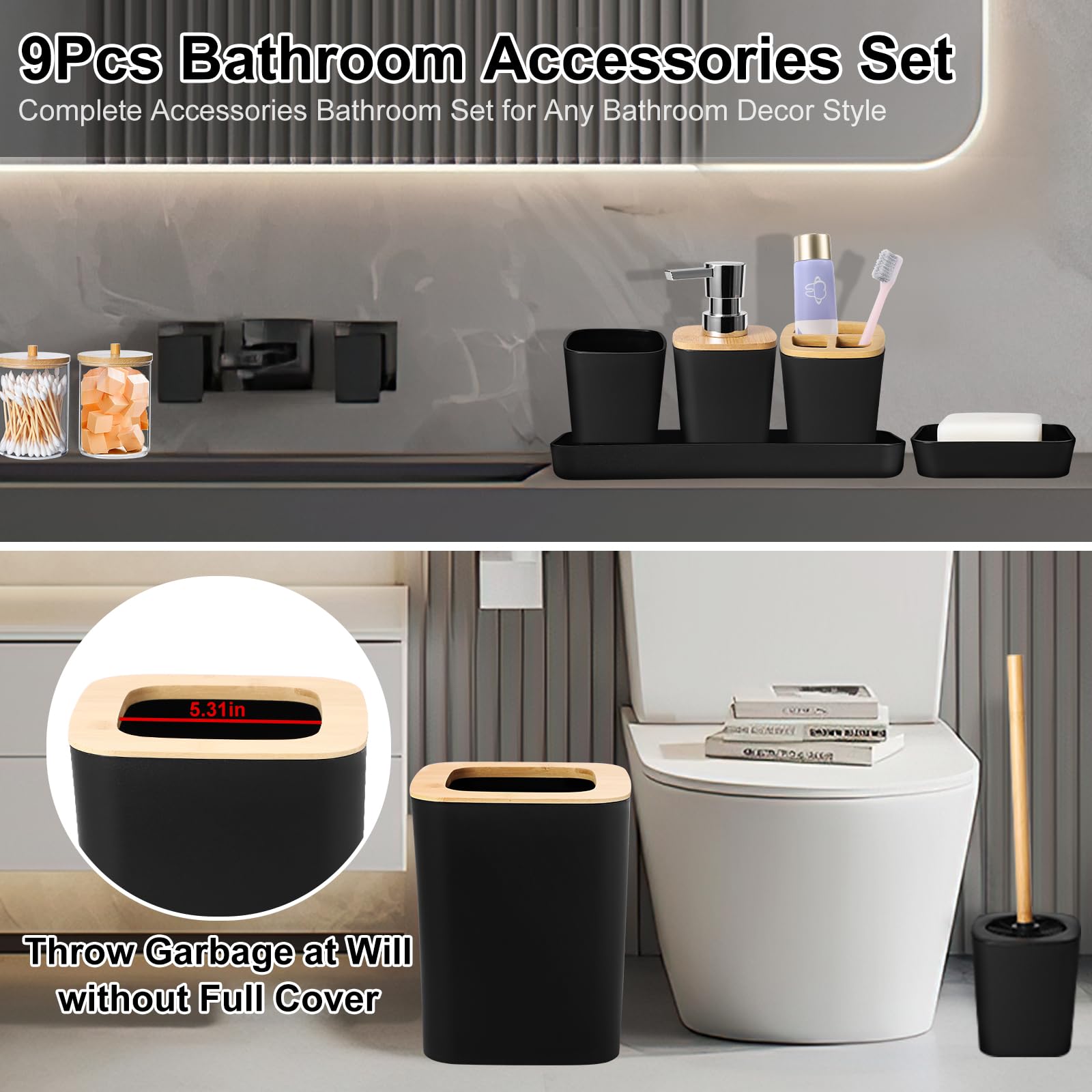 9-teiliges Badezimmer Set Schwarz - Komplett-Zubehör Mit Mülleimer & Seifenspendern
