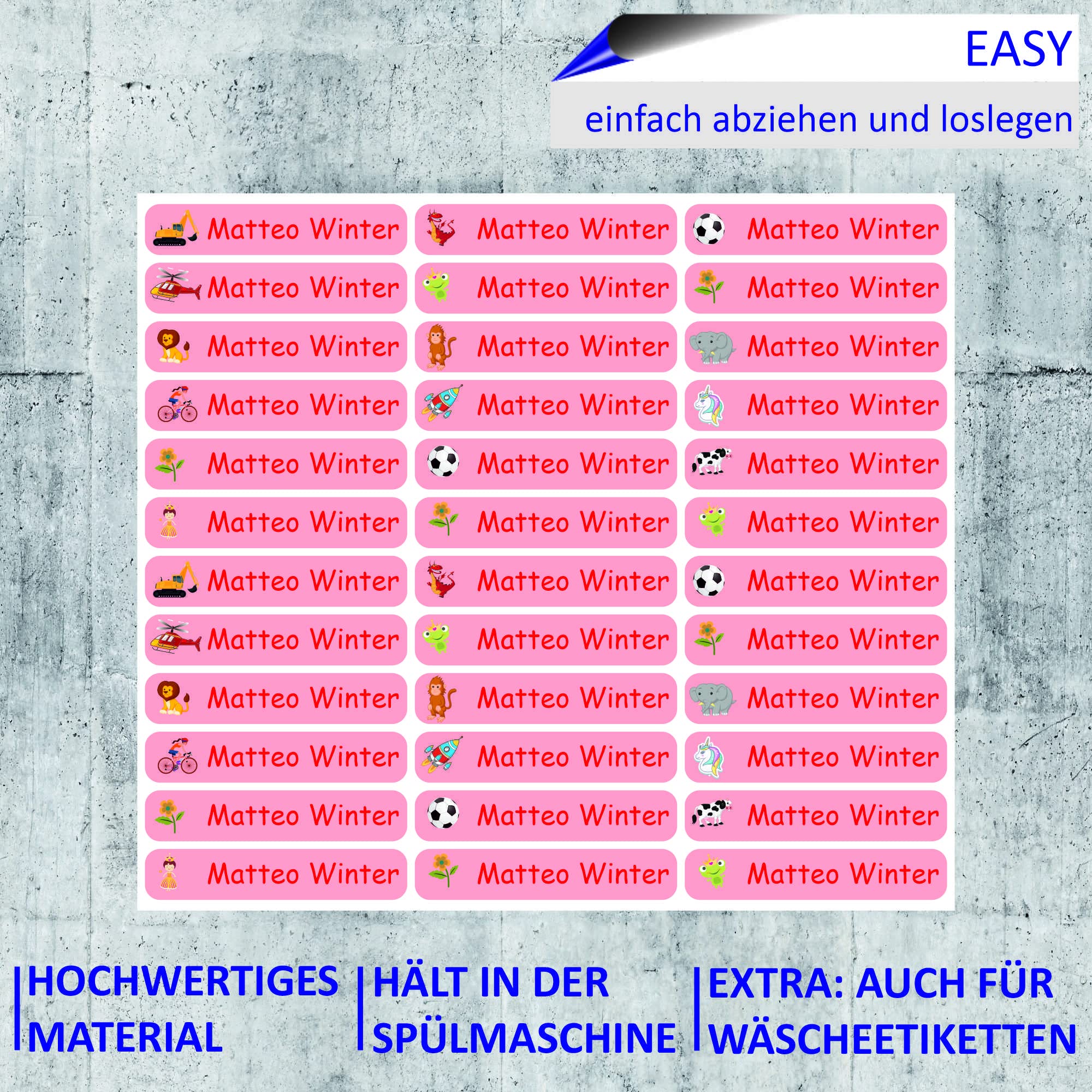 Nie wieder verlorene Stifte oder Kleidung! Diese 90 personalisierten Namensetiketten in 49x8mm sind perfekt für Schule, Kindergarten und Freizeit. Einfach selbstklebend - kein Bügeln nötig! Wasserdicht und UV-beständig - waschen, trocknen, sonnen - die Aufkleber bleiben! Mit matter Oberfläche und starkem Kleber der nach wenigen Minuten voll haftet. Ideal für Stifte, Brotdosen, Trinkflaschen, Kleidung, Schuhe - einfach überall! Verschiedene Farben und Motive zur Auswahl. Einfach online personalisieren - Name eingeben, Motiv wählen, fertig! Schnelle Lieferung trotz Individualdruck! Perfekt für die Anforderungen in Kindergarten, Tagheim oder Schule. So behält dein Kind immer den Überblick über seine Sachen! Praktisch für Geschwisterkinder - jeder bekommt seine eigenen Etiketten! Ein echter Lebensretter für alle Eltern!