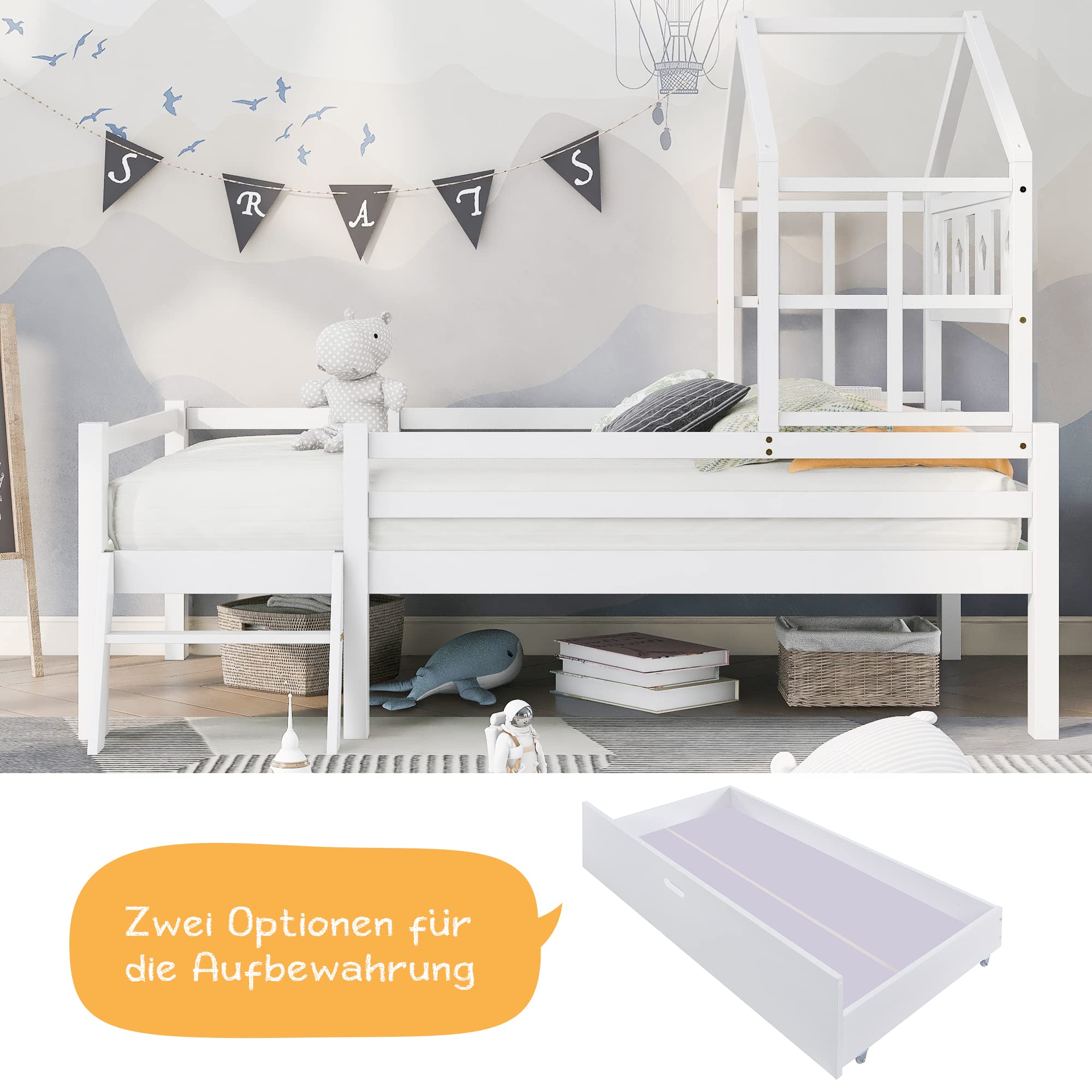 Aoskem Kinder Hausbett 90x200 Cm - Weißes Spielbett Mit Schutzgittern