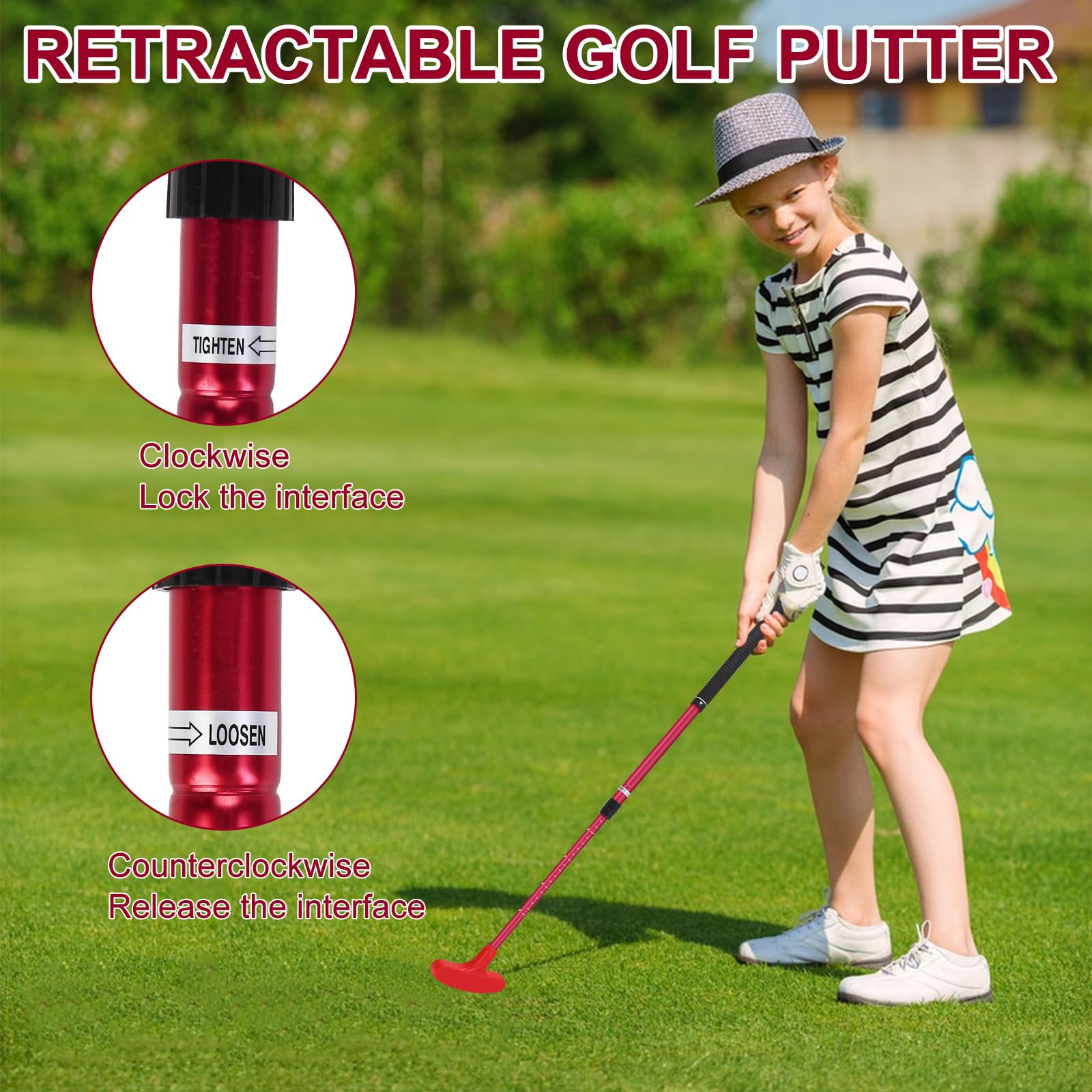 Golfspaß für die ganze Familie! Dieser verstellbare Putter wächst praktisch mit - von 53 bis 93 cm Länge ist für jeden was dabei, ob Kind oder Erwachsener.\n\nDas robuste Aluminiumgehäuse garantiert Langlebigkeit und ein präzises Spielgefühl. Der weiche TPR-Griff liegt gut in der Hand und ist rutschfest - selbst bei feuchten Händen behältst du die Kontrolle.\n\nDie praktische Skala an der Schaftverstellung zeigt dir genau, welche Länge eingestellt ist. So findest du schnell die optimale Schlaglänge für deine Körpergröße. Perfekt für das Training zu Hause oder auf der Driving Range!\n\nEgal ob Rechts- oder Linkshänder: Dieser Putter ist beidseitig nutzbar. Der Silikonschutz am Putterkopf schützt vor Beschädigungen, wenn mal ein Schlag daneben geht.\n\nDrei coole Farben stehen zur Auswahl, damit jeder seinen persönlichen Favoriten findet. Ob im Garten, im Wohnzimmer oder auf dem Golfplatz - mit diesem Putter machst du immer eine gute Figur!\n\nVerstellbare Länge: 53-93 cm\nMaterial: Aluminiumlegierung + ABS\nGriff: TPR-Material, rutschfest\nNutzbar für: Rechts- und Linkshänder\nFarboptionen: 3 verschiedene Farben\nKopf: Mit Silikonschutz\nIdeal für: Kinder, Jugendliche, Erwachsene