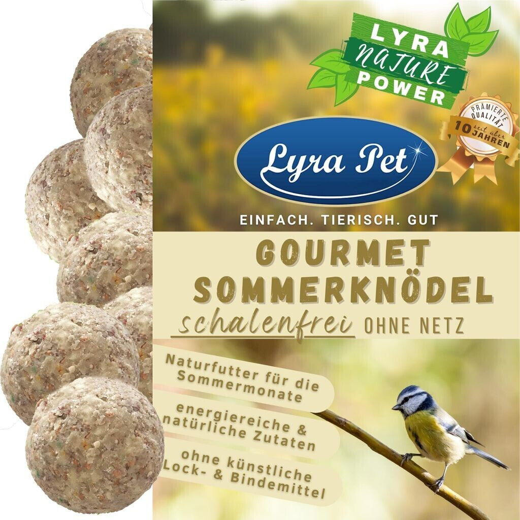 Perfektes Vogelfutter das ganze Jahr über! Diese Meisenknödel von Lyra Pet kommen ohne lästiges Netz - viel sicherer für die Vögel und umweltfreundlicher. Die 9kg Packung mit 100 Knödeln à 90g hält ewig! Zusammensetzung: Getreide (Mais, Weizen), Rindertalg, Sonnenblumenkerne und Mineralstoffe - alles naturrein ohne Zusatzstoffe. Perfekt für Meisen, Finken und andere Körnerfresser. Im Winter geben sie Energie gegen die Kälte, im Sommer Power für die Aufzucht der Jungen. Einfach in Futterspender, Astlöcher oder auf Futterstellen legen. Wichtig: Bei warmem Wetter können die Knödel weicher werden - das ist normal bei natürlichem Fett! Gebrochene Stücke einfach als Streufutter verwenden. Damit tust du den Vögeln und der Natur was Gutes!
