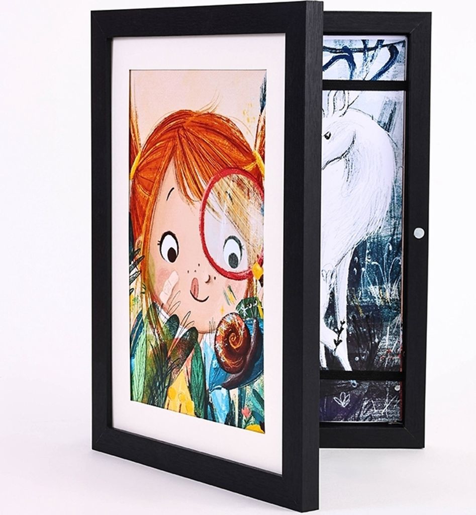 Präsentiere die Kunstwerke deiner Kinder wie in einer Galerie! Diese 2 weißen Bilderrahmen mit praktischer Frontöffnung machen das Ausstellen von Zeichnungen super einfach. Einfach den magnetischen Verschluss öffnen, das neue Kunstwerk einsetzen und schließen - kein Rahmen abnehmen nötig! Aus stabilem MDF-Holz mit bruchsicherem Plexiglas, absolut kindersicher. Die Innenhöhe von 2cm fasst bis zu 150 Blatt - perfekt um die schönsten Werke zu sammeln. Mit elastischen Haltebändern und Aufhängevorrichtung. So werden Kinderzimmer, Wohnzimmer oder Klassenzimmer zur privaten Kunstausstellung!