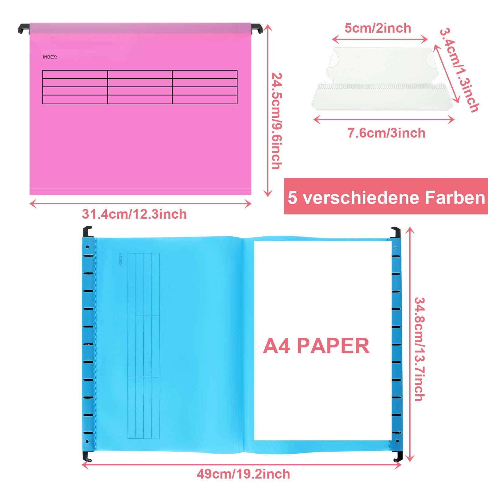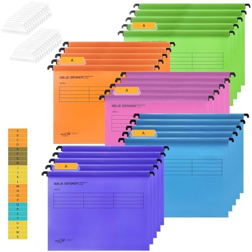 Ordnung muss sein! Mit diesen 10 Hängemappen im Set kriegst du deine Dokumente super organisiert. Jede Mappe fasst bis zu 200 A4-Blätter - also richtig viel Platz für deine Unterlagen. Sie kommen in 5 verschiedenen Farben: Blau, Orange, Rot, Gelb und Grau, je zwei von jeder Farbe. So kannst du nach Themen, Projekten oder Prioritäten sortieren und findest alles blitzschnell wieder. Aus stabilem Kraftpapier mit rostbeständigen Metallschienen - die halten was aus! Maße: 30,8 x 23,7 cm, Schienenlänge 34,3 cm - passen perfekt in Standard-A4-Regale und Schubladen. Ob im Büro, zu Hause oder in der Schule - mit diesen Mappen behältst du den Überblick. Einfach die mitgelieferten Etiketten beschriften und schon ist alles an seinem Platz. Nie wieder Suchen, immer alles griffbereit!