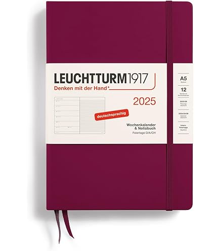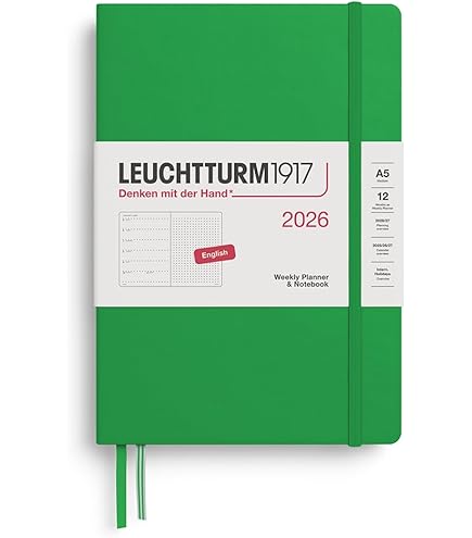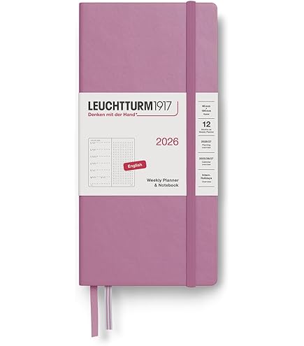 Organisations-Fans, dieser LEUCHTTURM1917 Wochenkalender für 2026 ist euer neuer bester Freund! Im praktischen A5-Format (14,5x21 cm) mit Hardcover-Einband und deutschem Kalendarium von Januar bis Dezember 2026. Auf der linken Seite findet ihr die komplette Woche, rechts eine dotted Seite für Notizen - perfekt für Termine und Ideen! Mit 3-Jahresübersicht, Projektplaner, heraustrennbaren Blättern, Mondphasen und internationalen Feiertagen. Das 80g/m² säurefreie FSC-Papier ist tintenbeständig und super angenehm zu beschreiben. Praktische Extras: Verschlussgummi, zwei Lesezeichen und Falttasche im Einband. Ein hochwertiger Begleiter für ein organisiertes Jahr 2026!