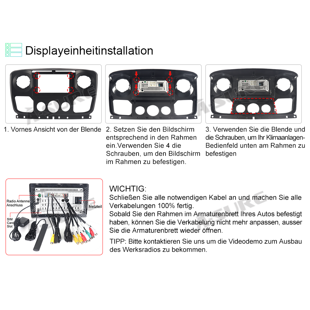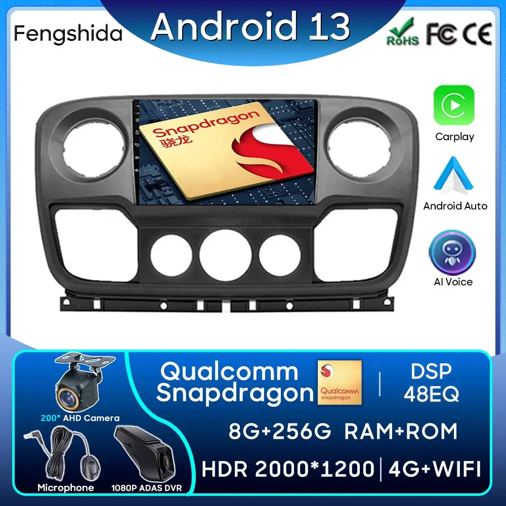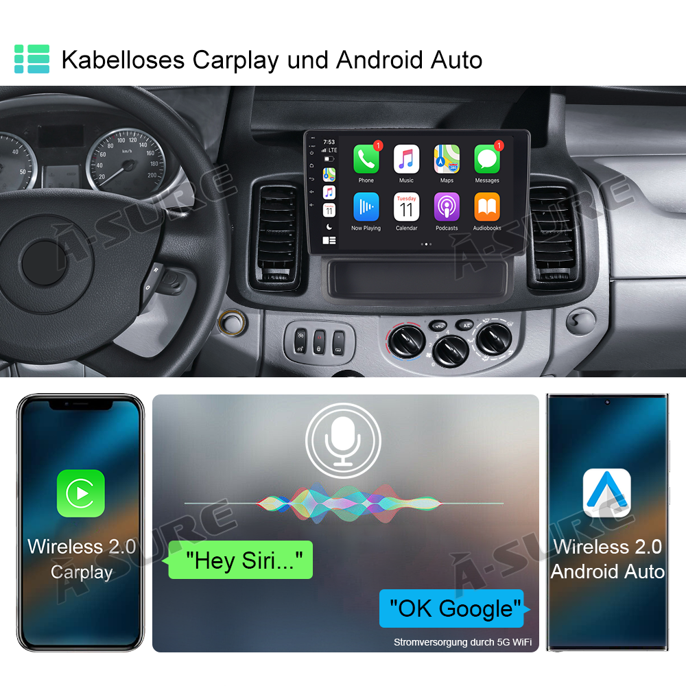 Modernisiere deinen Renault Master oder Opel Movano B mit diesem Premium Android Autoradio! Mit 10,1 Zoll großem HD-Touchscreen (1280x800) und Android 14 System bietet es dir alle modernen Features. Der 8-Core Prozessor mit 4GB RAM und 64GB ROM sorgt für ultraschnelle Performance. Kabelloses und kabelgebundenes CarPlay/Android Auto sind beide unterstützt - verbinde einfach dein Smartphone und du hast Zugriff auf Navigation, Musik, Anrufe und mehr. Mit 4G LTE und Dual-Band WiFi bist du immer online für Echtzeit-Navigation und Streaming. Der integrierte DSP-Sound mit 16-Band Equalizer sorgt für professionellen Klang. CANBUS-Integration ermöglicht volle Lenkradsteuerung und Fahrzeugdaten-Anzeige. Plug-and-Play Installation mit passendem Rahmen und allen notwendigen Kabeln. Dual-USB-Anschlüsse für gleichzeitiges Laden und Datenübertragung. Unterstützt DAB+, OBD2 und Sprachsteuerung für StVO-konforme Bedienung. Robustes Design - ideal für gewerblichen Einsatz. Alles dabei für die einfache Installation!