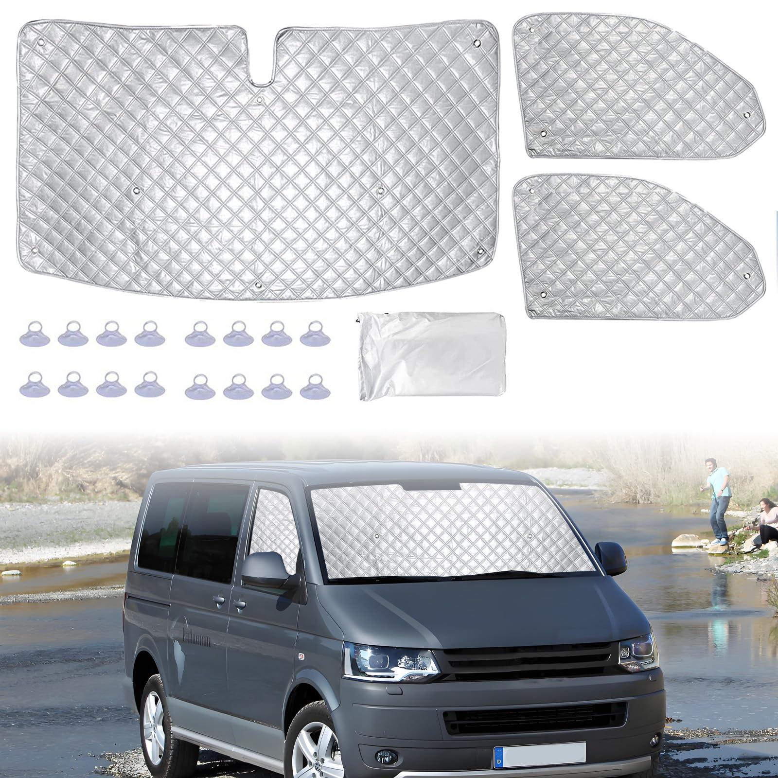 Diese Frontscheiben-Abdeckung für den VW T5 ist ein echter Alleskönner! Im Sommer hält sie die Hitze draußen, im Winter schützt sie vor Frost und Eis. Speziell für VW T5 Modelle von 2003-2015 maßgeschneidert - passt perfekt! Mit reflektierender Aluminiumschicht außen und wärmeisolierender Baumwolle innen. Einfach mit den Klettverschlüssen und Seitenschlaufen befestigen - hält auch bei Wind bombenfest. Die schwarze Innenseite sorgt für totale Verdunkelung, super für Camper oder wenn du im Auto schlafen willst. Spart dir morgens lästiges Eiskratzen und hält im Sommer das Auto kühl. Wird mit praktischer Aufbewahrungstasche geliefert - klein zusammenfaltbar und platzsparend. Aus wasserdichtem Oxford-Stoff, echt langlebig. Für VW T5, T5 California und Transporter. Einfach montieren und ganzjährig geschützt!