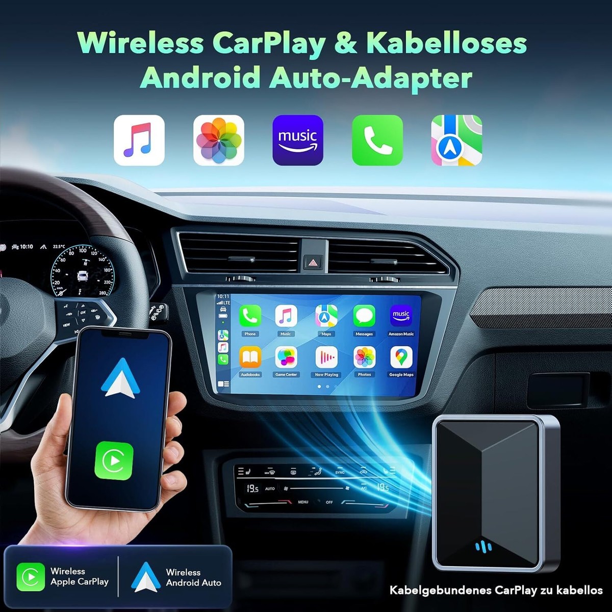 Endlich Schluss mit lästigen Kabeln im Auto! Dieser Wireless CarPlay Adapter verwandelt dein kabelgebundenes CarPlay in Sekunden in eine kabellose Lösung. Einfach den Mini-Dongle in den USB- oder Type-C-Anschluss stecken und schon kannst du Navigation, Musik, Anrufe und Siri komplett kabellos nutzen. Mit modernstem Smart-Chip und Dual-Band WiFi (2,4 GHz + 5,8 GHz) für eine super stabile Verbindung ohne lästige Verzögerungen. Nach der Erstinstallation verbindet sich dein iPhone automatisch beim Starten des Autos - einfach einsteigen und losfahren! Kompatibel mit über 800 Automodellen ab Baujahr 2016, die werksseitig kabelgebundenes CarPlay unterstützen. Funktioniert mit iPhone iOS 10 und höher. Achtung: Nicht kompatibel mit BMW, Tesla, Jeep Compass und älteren Nissan-Modellen. Das kompakte Aluminium-Gehäuse sieht nicht nur edel aus, sondern sorgt auch für gute Wärmeableitung. Inklusive USB-A und USB-C Kabeln. Mit 2 Jahren Garantie - probier es aus und genieße die Freiheit ohne Kabel!