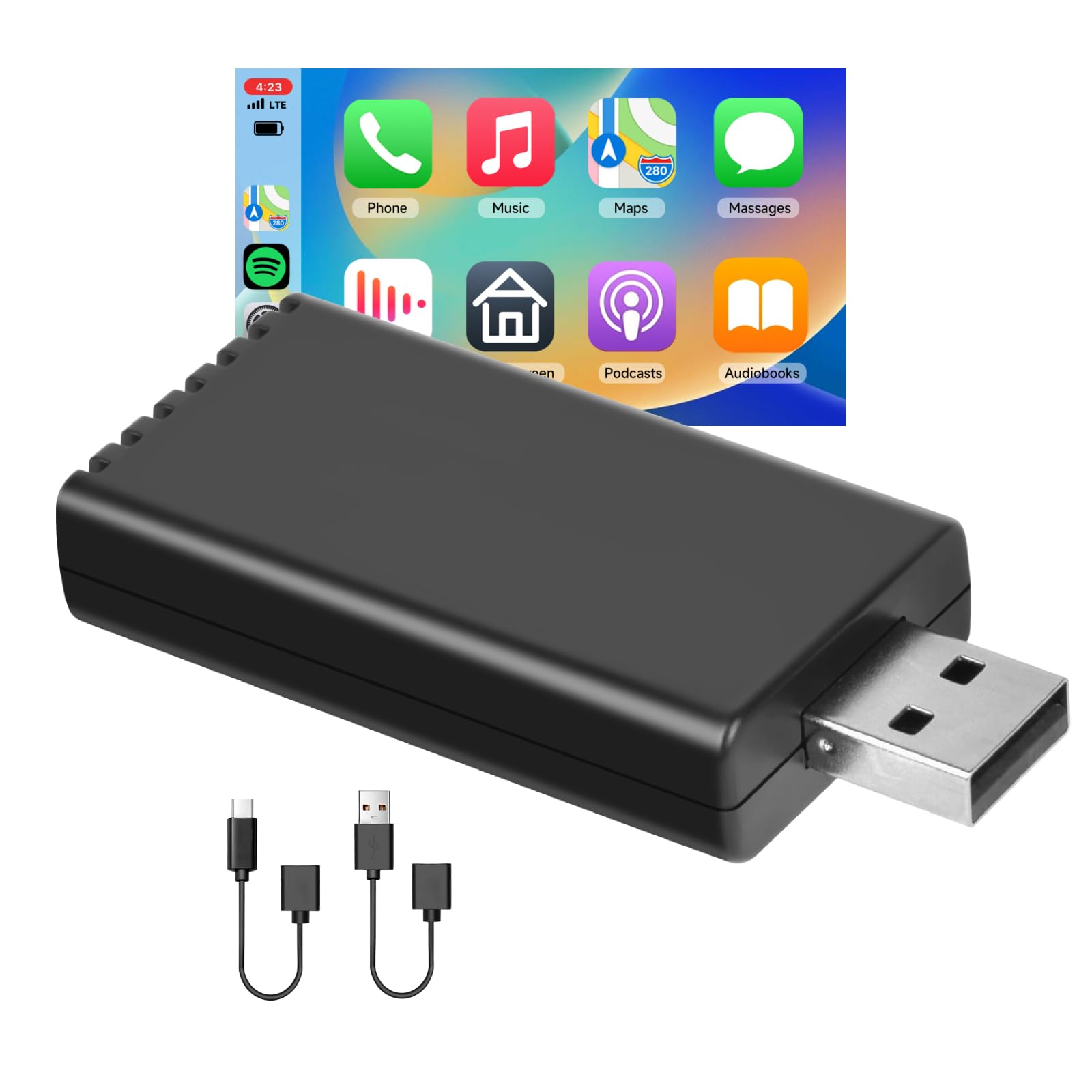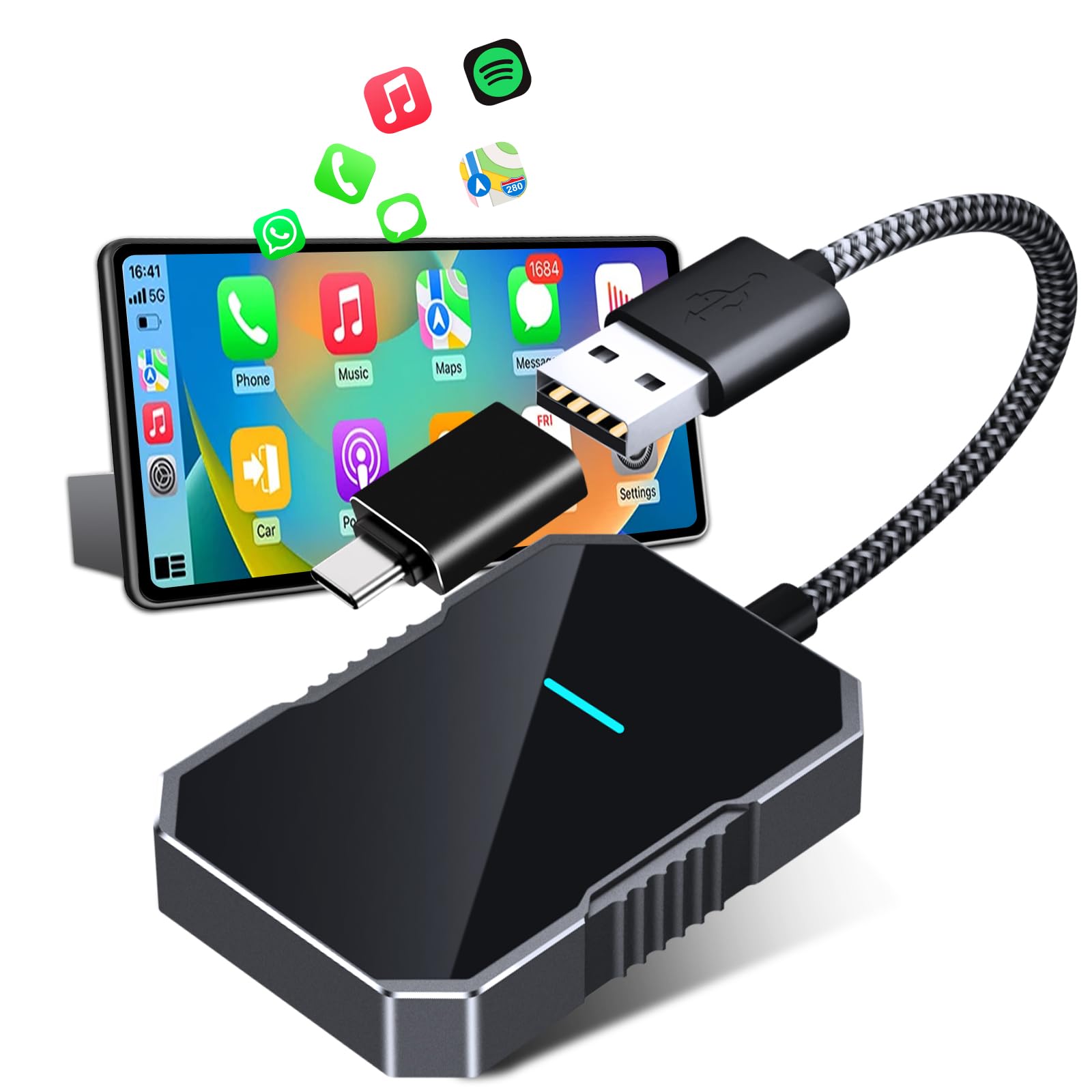 Endlich kabellos fahren! Dieser Adapter macht aus deinem kabelgebundenen CarPlay ein wireless System. Einfach in den USB-Port stecken - fertig! Kompatibel mit Autos ab Baujahr 2016. Unterstützt iPhones mit iOS 10+ und Android 11+. Mit Bluetooth 5.2 und WiFi für stabile Verbindung. Kaum Verzögerung bei Musik und Navigation. Verbindung stellt sich automatisch her - kein langes Warten. Mit USB-A und USB-C Anschlüssen. Schlankes Design - stört nicht im Auto. Nie wieder Kabelsalat! Genieße die Freiheit und behalte dein Handy in der Tasche. Einfacher geht's nicht!