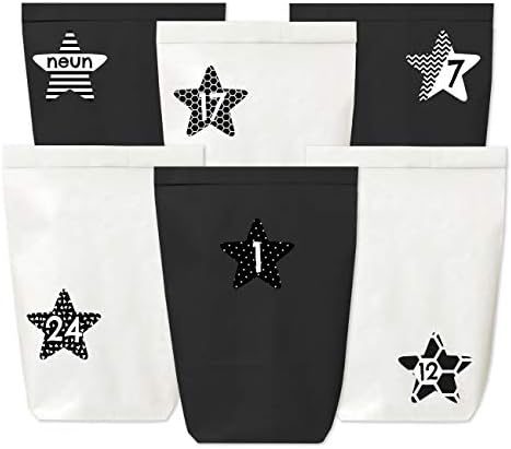 Bastle dir deinen persönlichen Adventskalender! Dieses komplett Set enthält 24 weiße Kraftpapiertüten (22x14x5 cm), 24 Zahlenaufkleber im schicken Sternen-Design und 24 naturfarbene Holzklammern. So kannst du deinen Kalender ganz individuell gestalten und mit Süßigkeiten, kleinen Geschenken oder Gutscheinen befüllen. Die Tüten haben einen stabilen Boden und bieten reichlich Platz für Überraschungen. Mit den Holzklammern verschließt du die Tüten sicher und kannst sie auch aufhängen - ob an einer Schnur, aufgereiht im Regal oder an der Wand. Das schwarze Sternen-Motiv wirkt modern und passt zu jedem Einrichtungsstil. Made in Germany - da weißt du, was du hast. In unserem Shop findest du noch viele weitere Motive für jeden Geschmack. So wird die Vorweihnachtszeit besonders persönlich!