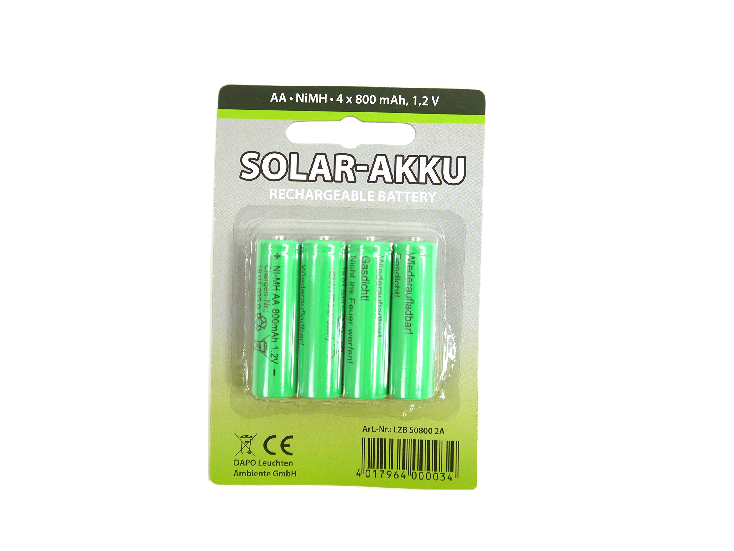 Schluss mit Batterien kaufen! Diese 12 wiederaufladbaren AA Akkus mit 800mAh halten deine Solarleuchten und Haushaltsgeräte am Laufen - und das immer wieder!\\n\\nSpeziell entwickelt für Solarleuchten, die schnell entladen werden. Perfekt auch für Rauchmelder, Fernbedienungen, Spielzeug und Kameras. Einfach aufladen, einlegen und Energie sparen!\\n\\nWarum diese Akkus?\\n• 800mAh echte Kapazität - nicht nur auf dem Papier\\n• Funktioniert von -40°C bis +140°C\\n• Perfekt für Solarleuchten - laden sich tagsüber auf\\n• Umweltfreundlich - weniger Müll\\n• Kostensparend - nach 3x Laden schon Geld gespart\\n\\nIdeal für:\\n• Garten-Solarleuchten\\n• Rauchwarnmelder\\n• Fernbedienungen aller Art\\n• Elektrisches Spielzeug\\n• Taschenlampen und mehr\\n\\nTechnische Daten:\\n• Typ: Ni-MH\\n• Spannung: 1,2V\\n• Kapazität: 800mAh\\n• Größe: AA (14x50mm)\\n• Temperaturbereich: -40°F bis 140°F\\n\\nMit 12 Stück im Pack hast du immer Ersatz parat. Nie wieder im Dunkeln stehen weil die Batterien leer sind! Und die Umwelt freut sich auch - weniger Einwegbatterien im Müll.