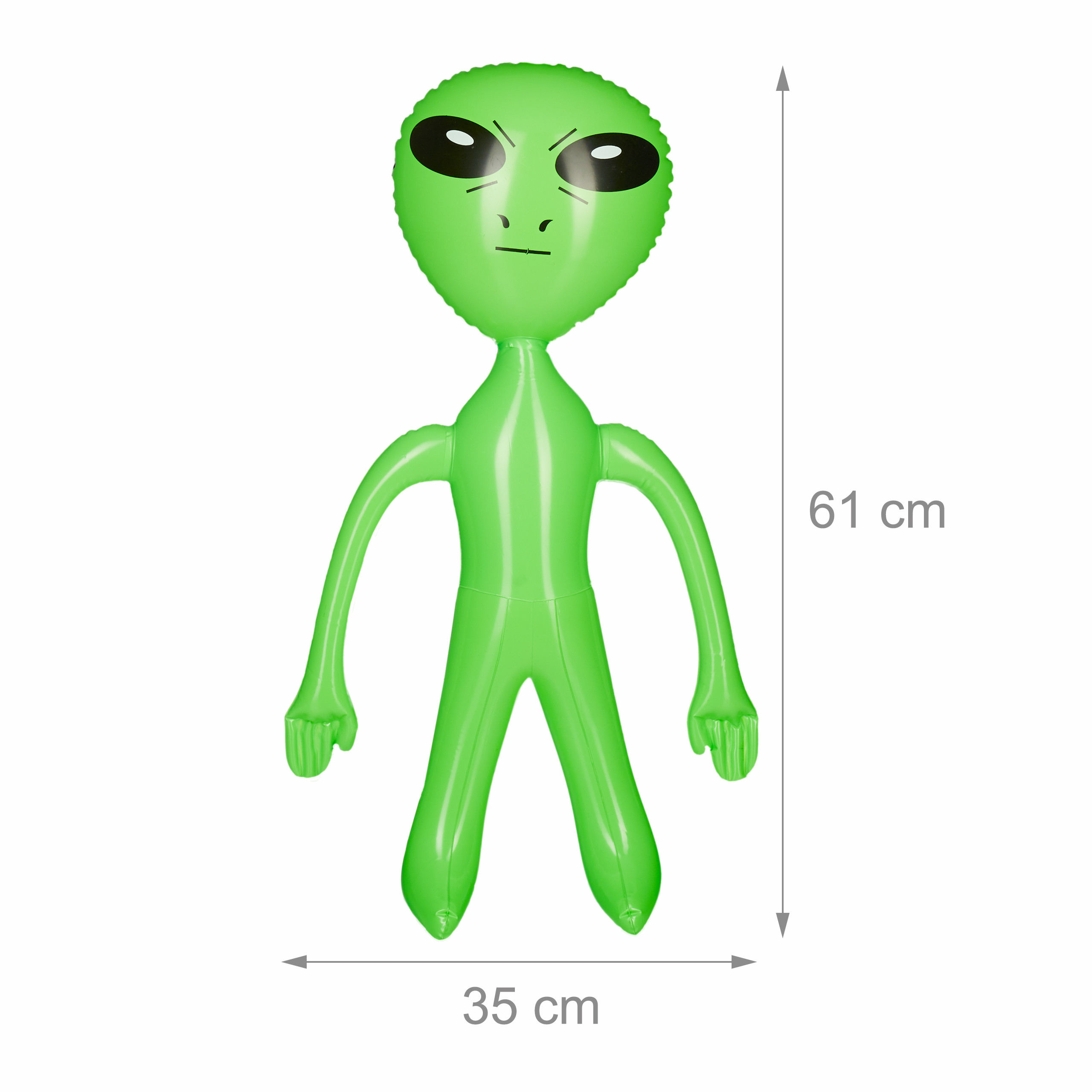 UFO-Alarm in deinem Wohnzimmer! Diese drei riesigen Alien-Luftballons in Lila, Blau und Grün bringen sofort Partystimmung. Jeder Alien ist stolze 85cm groß und kann stehen oder aufgehängt werden. Aus dickem PVC-Material das nicht so schnell kaputt geht - halten wochenlang die Luft. Mit den niedlichen großen Augen und Gliedmaßen sind sie der absolute Hingucker auf jeder Halloween-Party, Karneval oder Weltraum-Mottoparty. Einfach mit Luftpumpe aufblasen und schon verwandelst du deine Wohnung in eine Alien-Basis. Super als Foto-Hintergrund oder Eingangsdekoration. Nach der Party zusammenfalten und fürs nächste Mal aufbewahren. Die Kids werden aus dem Staunen nicht mehr rauskommen!