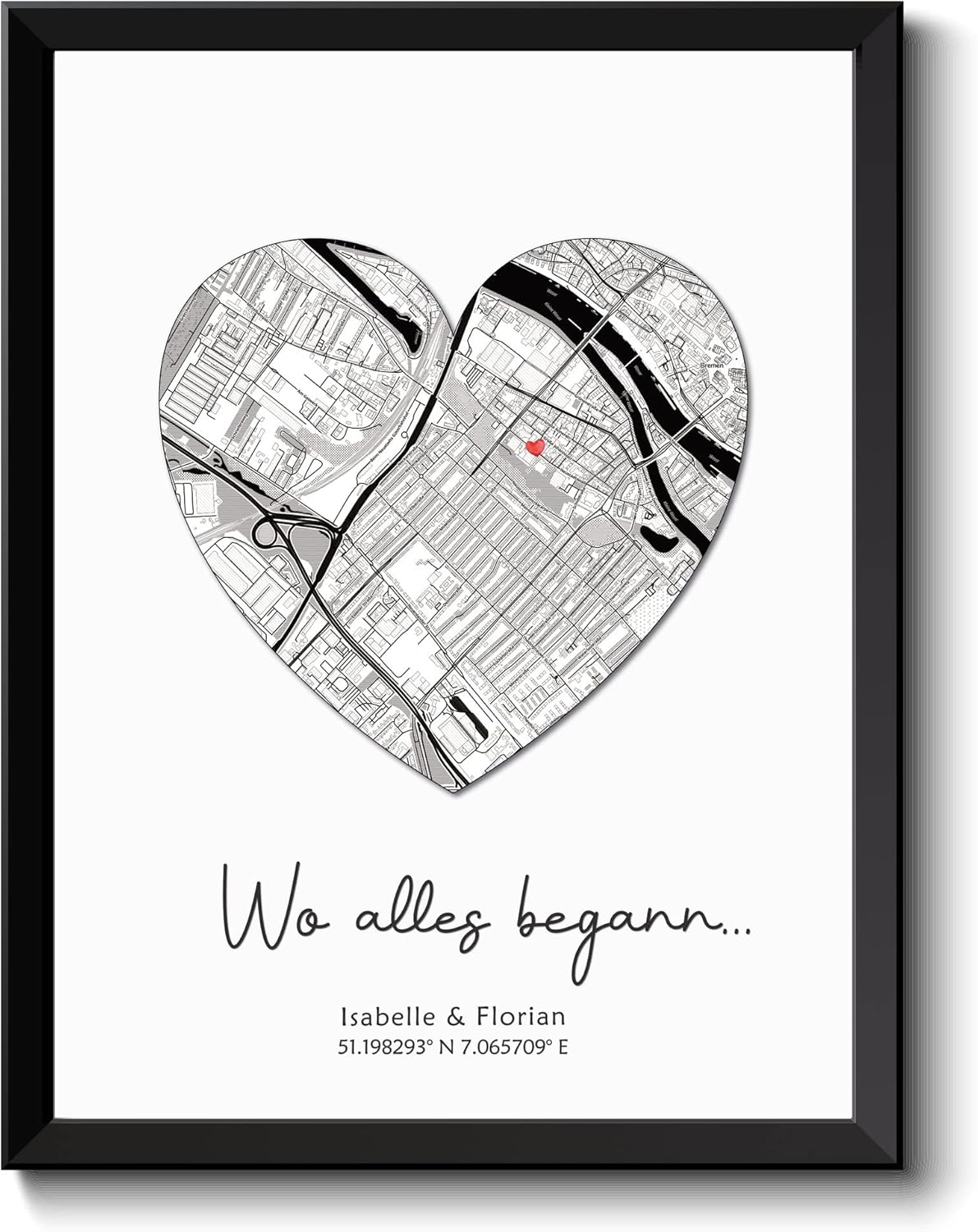 Suchst du nach einem wirklich besonderen Geschenk für deinen Partner? Dieses personalisierte Poster erzählt eure Liebesgeschichte auf eine ganz einzigartige Weise! Du kannst individuelle Koordinaten (wo ihr euch kennengelernt habt, wo der erste Kuss war, wo ihr heiraten wollt...) sowie persönliche Daten und Nachrichten hinzufügen. Jedes Poster wird in Deutschland in Handarbeit gefertigt und auf hochwertigem Papier gedruckt - das garantiert nicht nur eine tolle Optik, sondern auch Langlebigkeit. Egal ob zum Jahrestag, Valentinstag, Geburtstag oder einfach so - mit diesem emotionalen Kunstwerk zeigst du deinem Liebsten, wie wichtig er/sie dir ist und welche besonderen Momente ihr schon gemeinsam erlebt habt. Die Gestaltungsmöglichkeiten sind nahezu unendlich! Das Beste: Du bekommst kein Massenprodukt, sondern ein Unikat, das genau eure Beziehung widerspiegelt. So ein Geschenk vergisst man nicht so schnell - versprochen! Perfekt für alle, die nach 'Geschenke für Freundin', 'Pärchen Geschenke' oder 'Jahrestag geschenk' suchen und damit richtig punkten wollen!