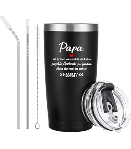 Auf der Suche nach dem perfekten Geschenk für Papa? Das Sinmoe Set hat alles! Enthalten sind ein Thermobecher aus Edelstahl (12 Unzen) mit Deckel und Strohhalm, ein Schlüsselanhänger mit süßem Spruch, ein Kugelschreiber, ne Grußkarte und n Korkuntersetzer. Jedes Teil ist mit liebevollen Botschaften bedruckt, wie 'Bester PAPA der Welt' – ideal für Vatertag, Geburtstag oder Weihnachten. Der Becher hält Getränke warm, der Anhänger verhindert Schlüsselverlust, und die Karte lässt dich persönliche Worte hinterlassen. Alles hochwertig und langlebig, also keine Billigware. Wenn du Papa ne Freude machen willst, die von Herzen kommt, ist dieses Set genau richtig. Einfach auspacken und überreichen – sein Lächeln ist garantiert. Hol es dir und zeig deinem Vater, wie sehr er geschätzt wird – denn er hat ja schon das beste Geschenk: dich!