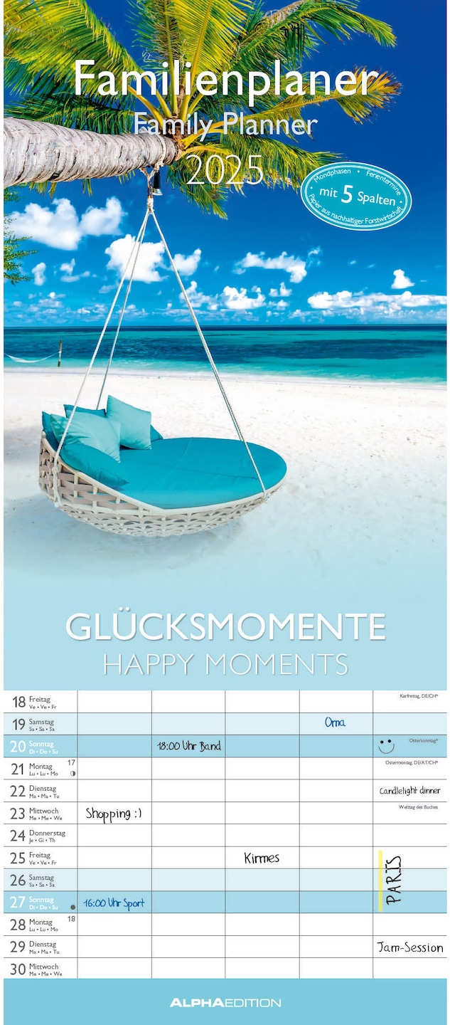 Planst du schon für 2026? Der Alpha Edition Zen Kalender ist dein ultimativer Helfer für den Familienalltag! Mit fünf Spalten behältst du easy den Überblick über Schule, Arzttermine, Sport und Familientreffs. Jede Seite ziert eine stimmungsvolle Naturfotografie – sorgt für Ruhe und cooles Ambiente in deinen vier Wänden. Das Hochformat (19,5x45 cm) gibt dir genug Platz für alle Notizen, und das 4-sprachige Kalendarium verrät dir alle Feiertage in DE, AT & CH. Dank Ringbindung blätterst du fix durch, und das FSC-Papier ist umweltfreundlich. So wird Organisieren zum Augenschmaus! Format: 19,5 x 45 cm | 5 Spalten | 4-sprachig (DE, FR, IT, EN) | Feiertage: DE/AT/CH | FSC-zertifiziert | Stabile Ringbindung. Perfekt für Familien, die's praktisch und schön mögen!