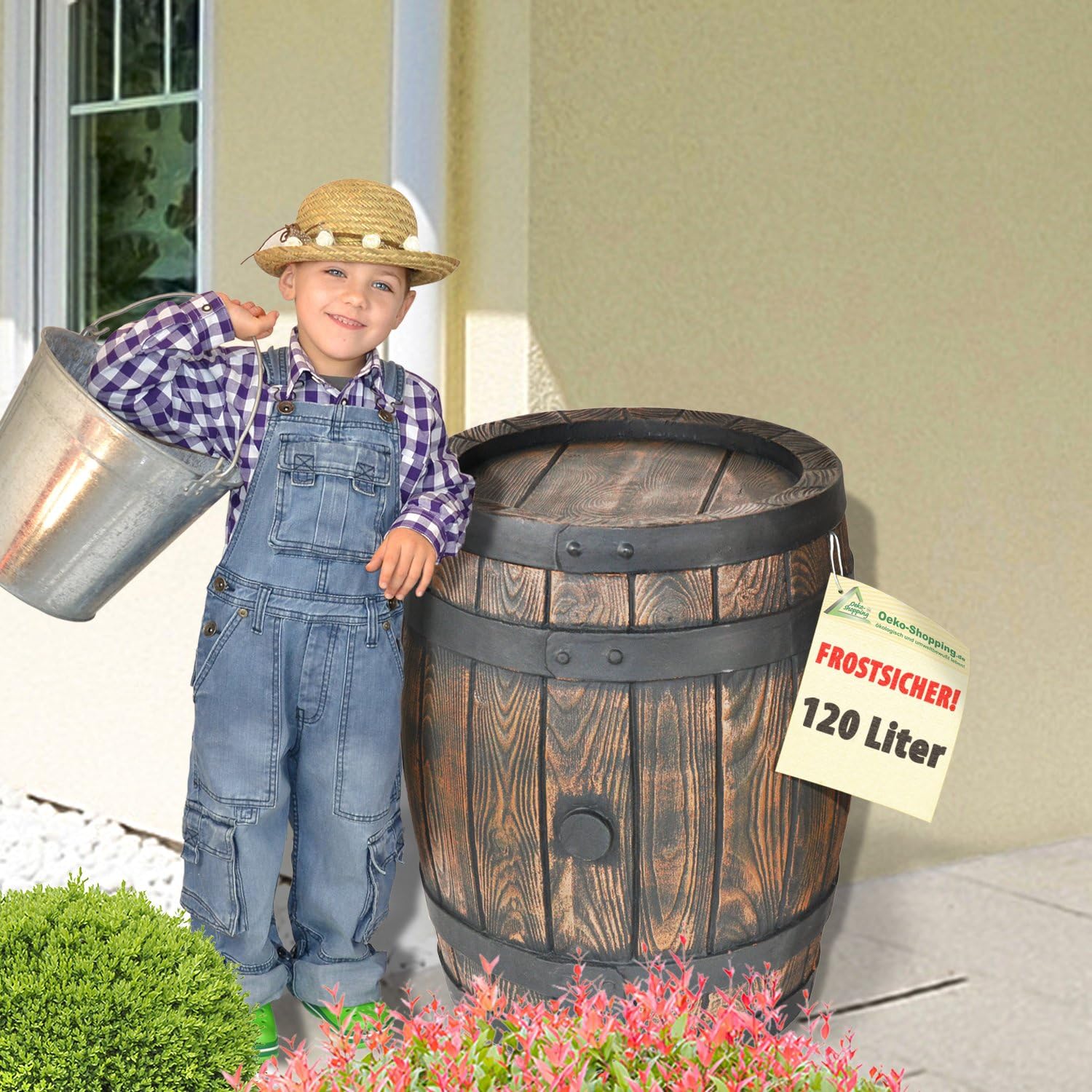 Diese Regentonne ist echt was Besonderes! Sieht aus wie eine antike Amphore in Terra-kotta Optik und hat oben noch eine integrierte Pflanzschale - also doppelt nützlich! Mit 300 Litern Fassungsvermögen sammelst du jede Menge Regenwasser für deine Pflanzen. Aus stabilem PE-Material, bruchfest und frostsicher bis -20°C. Die Lieferung enthält alles was du brauchst: Wasserhahn, Wasserstandsanzeige und sogar einen Fallrohrfilter T33 in braun. Der Filter sorgt dafür, dass kein Dreck ins Wasser kommt und hat eine Füll-Stopp-Automatik. Maße: 114cm hoch, 64cm Durchmesser in der Mitte. Zwei Anschlüsse für Schläuche sind schon vorbereitet. Sieht nicht nur super aus im Garten, sondern spart auch noch Wasser und Geld. Einfach aufstellen, ans Fallrohr anschließen und schon sammelst du kostenloses Gießwasser!