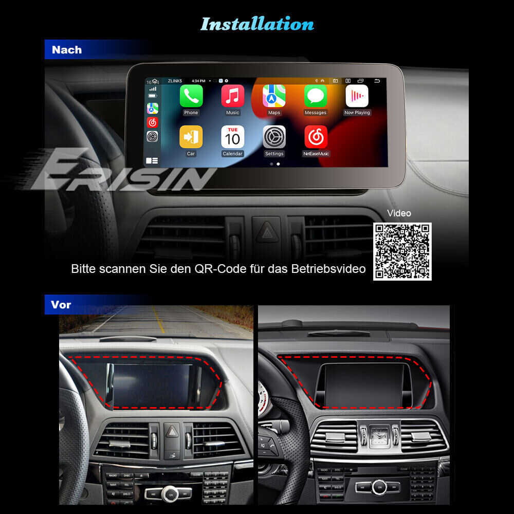 Upgrade dein Mercedes Infotainment! Dieses Erisin 10.25 Zoll Android Auto Radio passt perfekt für die E-Klasse W207/C207/A207 von 2013-2015 mit NTG 4.5 System. Mit modernem Android 12 Betriebssystem, 8-Core Prozessor und 4GB RAM + 64GB ROM für flüssige Performance. Integriertes Wireless Apple CarPlay und Android Auto - einfach Smartphone verbinden und loslegen. 10.25 Zoll IPS Display mit 1280x480 Pixel für gestochen scharfe Bilder. Behält originale Funktionen wie Lenkradbedienung und Fahrzeuginformationen bei. Mit 4G Modem, WiFi, Bluetooth 5.0 und GPS. Unterstützt Rückfahrkamera und DAB+. Einfache Installation ohne Originalkabel zu zerstören. Modernisiere dein Fahrzeug mit allen aktuellen Features!