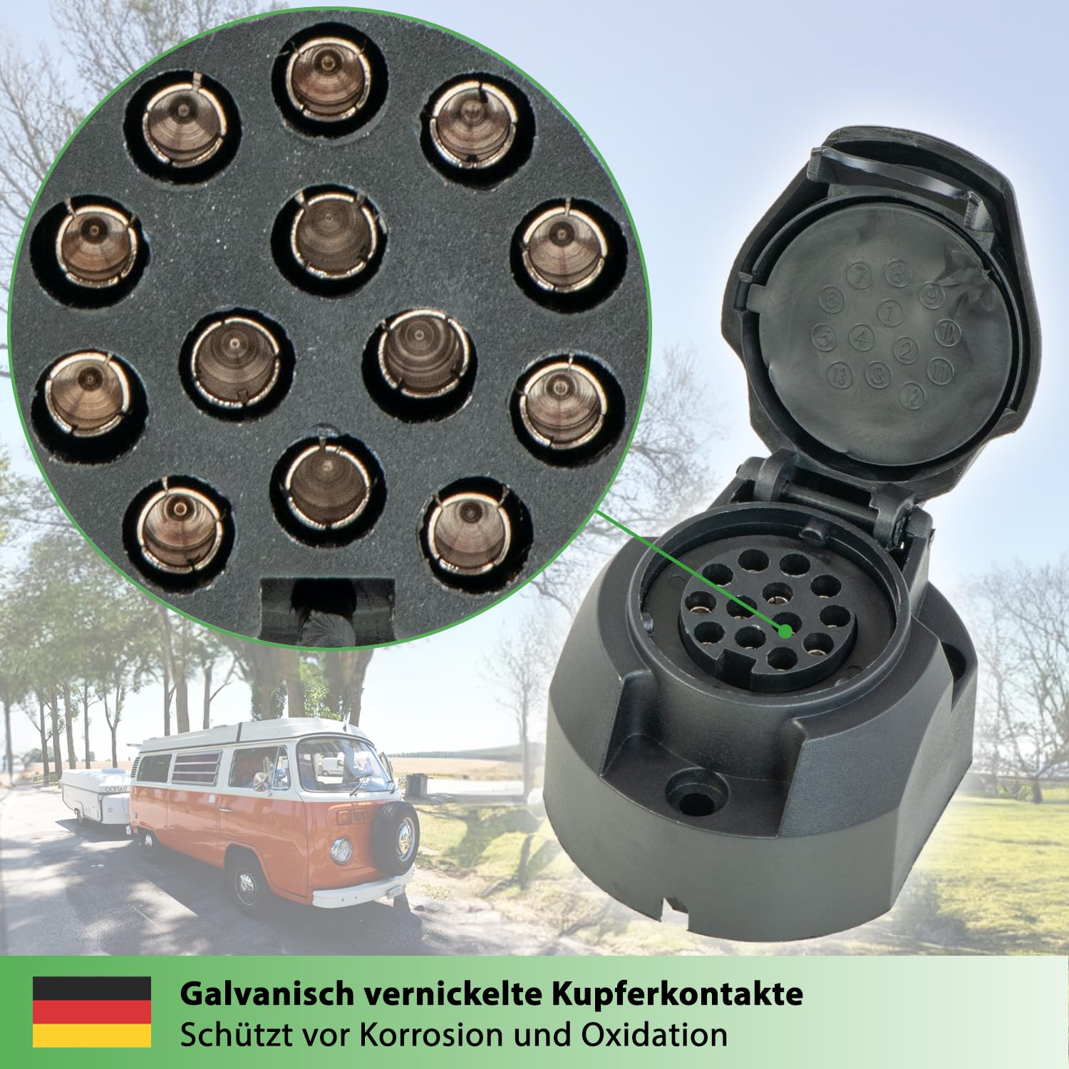Für alle die einen Anhänger ans Auto bringen wollen: Dieser 13-polige Stecker macht's einfach! Inklusive praktischer Verkabelungsschablone - kein Gefummel mehr mit falscher Belegung! Aus hochwertigem Material mit galvanisierten Kupferkontakten - rostfrei und langlebig. Maße 9,7x5,8x4,8 cm, für 12V und 24V Systeme geeignet. Einfache Montage: Stecker auseinanderschrauben, Kabel durchziehen, nach Schablone verkabeln, zusammensetzen - fertig! Kein Risiko dass am Anhänger das falsche Licht angeht. Perfekt für Wohnwagen, Bootstrailer, Pferdeanhänger oder Lastenanhänger. Deutsche Qualität die hält was sie verspricht. Hol dir den richtigen Stecker für sicheres Fahren - dein Anhänger wird es dir danken!