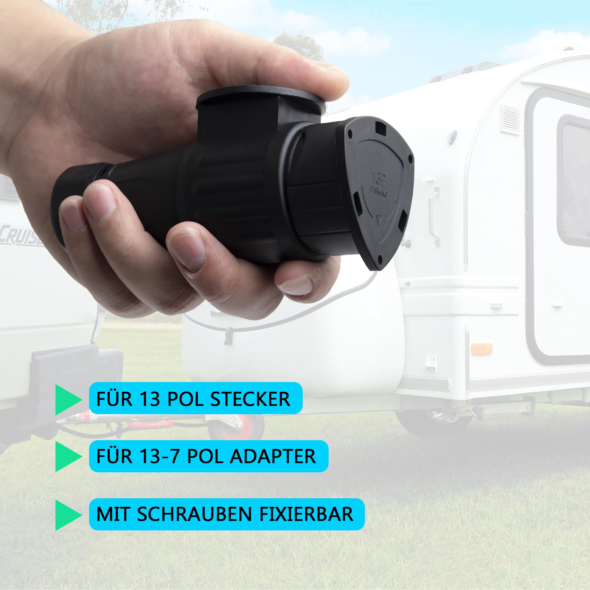 Schütze deine teure Anhängerkupplung vor Schmutz und Wetter! Diese praktischen Abdeckungen für 13-polige Anhängerstecker sind genau das, was du brauchst. Einfach aufstecken, drehen - und schon ist dein Stecker sicher geschützt. \\n\\nDie Abdeckung passt nicht nur auf reine 13-polige Stecker, sondern auch auf 13-auf-7-polige Adapter. Egal ob Auto, Wohnmobil oder Fahrradträger - hier ist für fast jedes Fahrzeug was dabei. \\n\\nAus hochwertigem Kunststoff gefertigt, sind die Kappen wetterfest und korrosionsbeständig. Sie halten auch bei extremen Bedingungen stand und schützen die empfindlichen Kupferkontakte zuverlässig. \\n\\nMontage in Sekunden: Einfach auf den Stecker setzen und im Uhrzeigersinn drehen bis es einrastet. Zum Abnehmen gegen den Uhrzeigersinn drehen. So einfach kann Schutz sein! Ein tolles Geschenk für alle Auto- und Wohnmobil-Fans in deinem Freundeskreis.