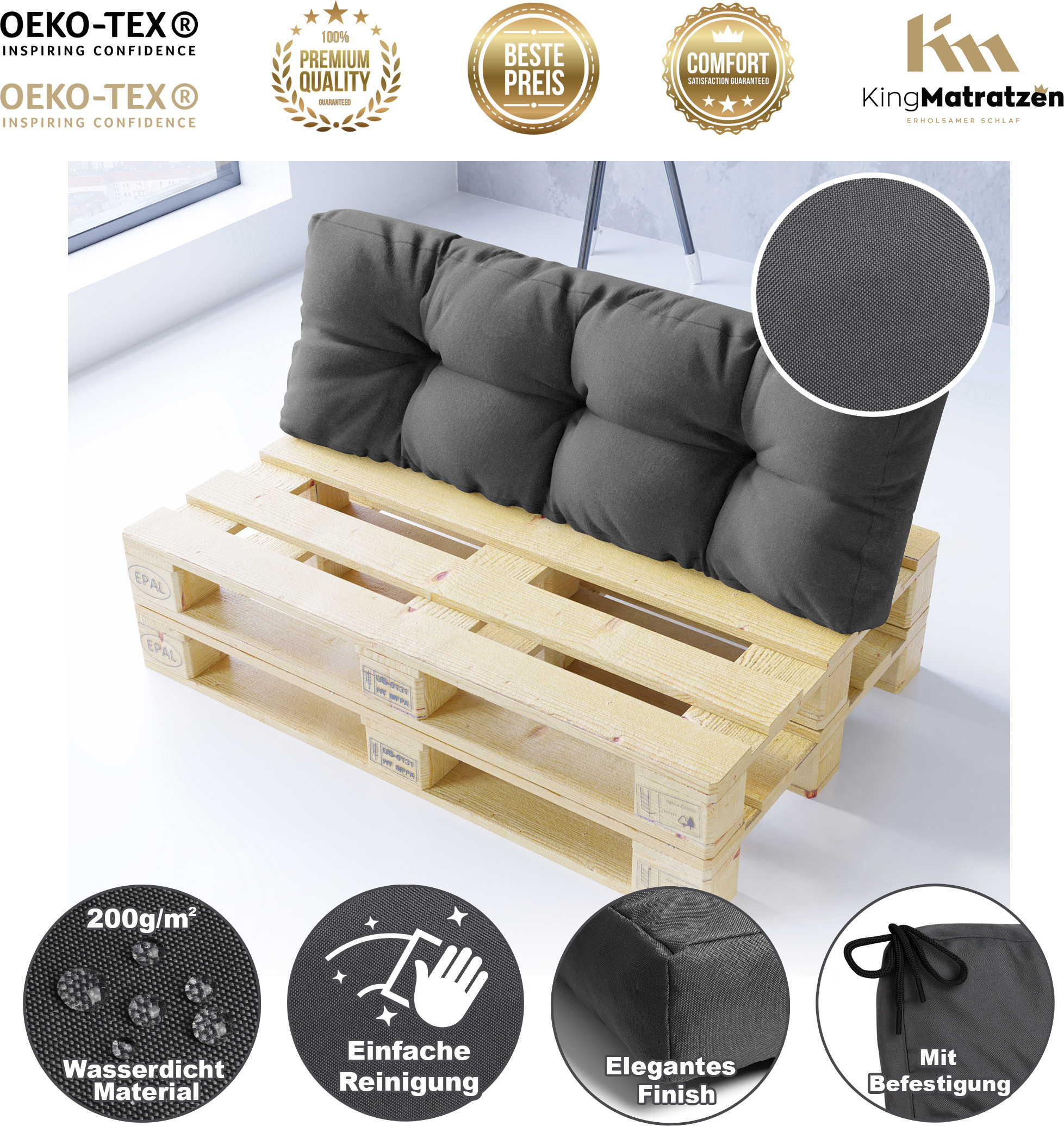 Mega bequem für deine Palettenmöbel! Dieses Rückenkissen in 60x40cm ist perfekt für Garten, Balkon oder Wohnung. Aus 60% Baumwolle und 40% Polyester - wasserabweisend und super weich. Die 20cm dicke Füllung ist formsstabil und hält auch als Bodenkissen. UV-beständig und nach Öko-Tex Standard ohne Schadstoffe. Der Bezug ist abnehmbar und bei 30°C waschbar. Handgefertigt in der EU mit über 30 Jahren Erfahrung. Mach deine Palettenmöbel gemütlich mit diesem hochwertigen Kissen!