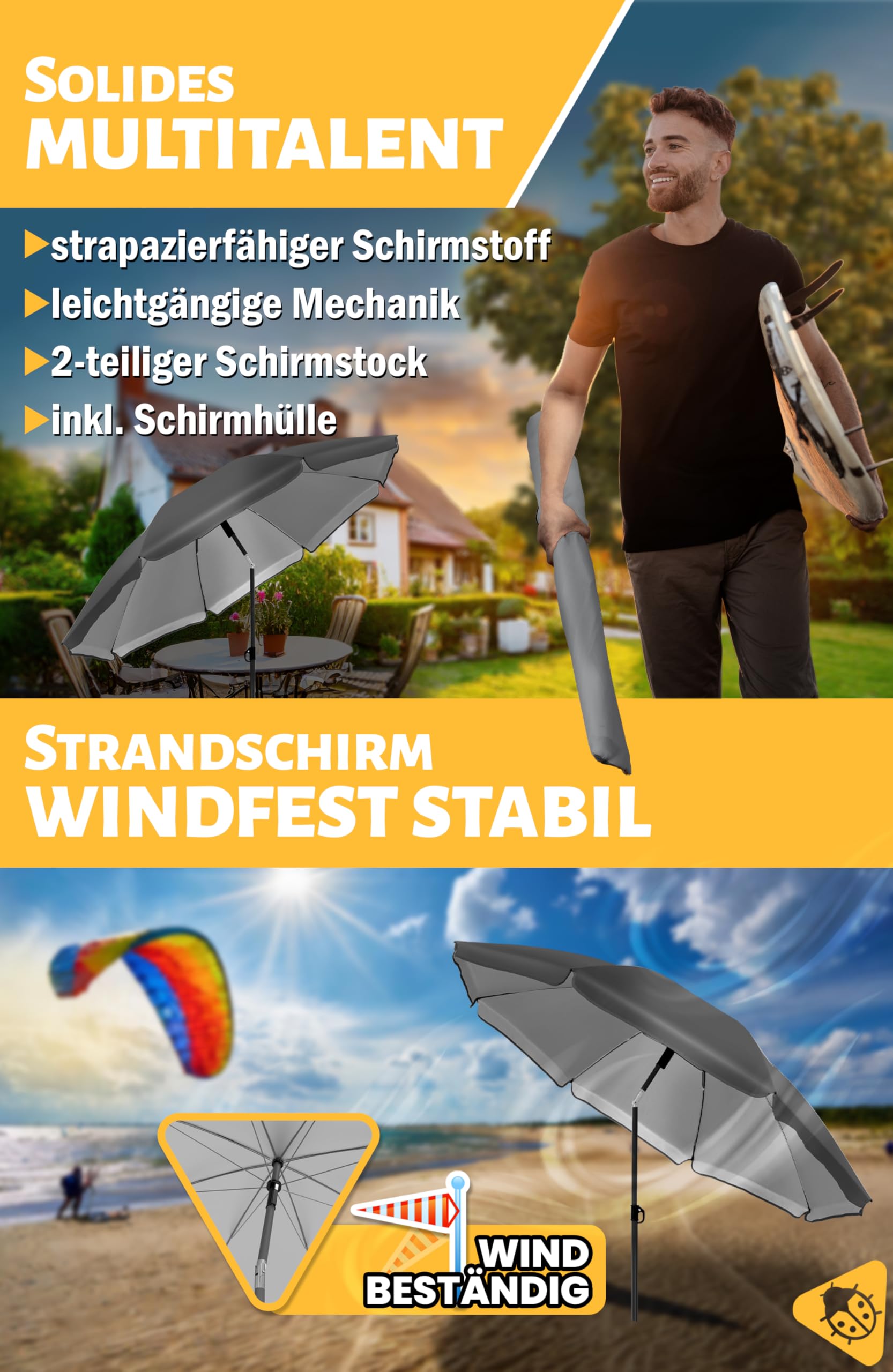 Endlich ein Sonnenschirm der wirklich hält was er verspricht! Mit 200cm Durchmesser bietet dieser Menz Strandschirm reichlich Schatten für die ganze Familie. Der UPF 50+ Schutz bewahrt dich zuverlässig vor schädlicher UV-Strahlung - ob am Strand, auf dem Balkon oder im Garten. Praktisch: Der zweigeteilte Stock und die beidseitige Knickfunktion machen ihn super flexibel. Mit dem integrierten Erdspieß steht er bombenfest im Sand oder auf der Wiese. Und die inklusive Schutzhülle mit Tragegurt macht den Transport zum Kinderspiel - perfekt für unterwegs! Einfach aufstellen, in den Boden stecken und den sonnigen Tag in vollen Zügen genießen - ohne Sonnenbrand!