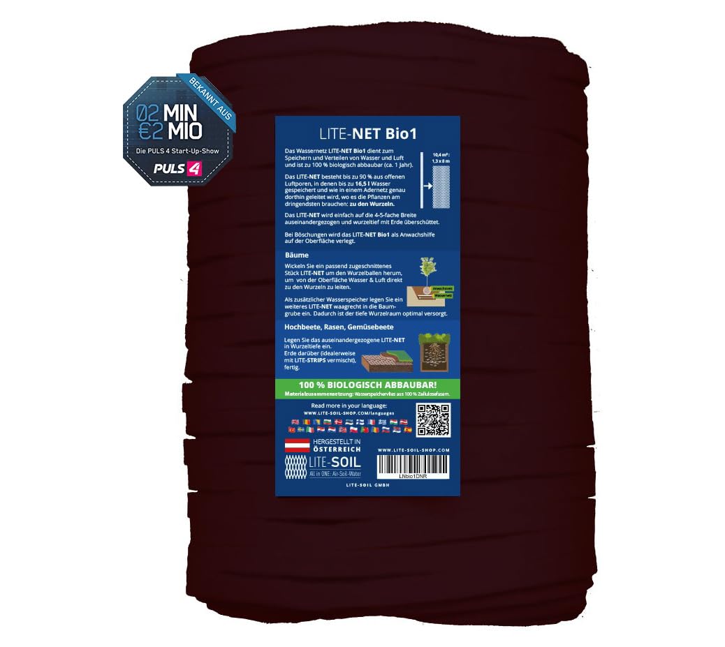 Das bio-abbaubare Netz eignet sich super für Bäume, Hochbeete, Gemüsebeete, Rasenflächen und sogar für größere Pflanzentröge. Einfach zuschneiden, einbauen und schon geht's los. Deine Pflanzen werden es dir mit kräftigem Wachstum danken! Hergestellt in Österreich, steht das LITE-NET für höchste Qualität und Nachhaltigkeit. Probier's aus und überzeug dich selbst - deine Pflanzen (und dein Wasserverbrauch) werden dir dankbar sein!