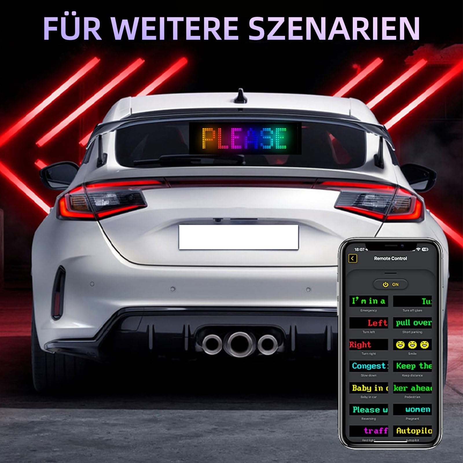 Willst du dein Auto oder deinen LKW richtig aufpeppen? Diese 2 Devil Eyes LED Displays sind der absolute Hingucker! Jedes Panel ist 12x60 cm groß und nur 2 mm dick - super flexibel und passt sich jeder Scheibe an. Per App (iOS/Android) oder Fernbedienung steuerst du die Displays komplett: schreib eigene Texte, lade Bilder oder GIFs hoch, wähl aus vielen Vorlagen oder stell Helligkeit und Farben ein. Mit IP65 Schutzklasse sind sie komplett wasserdicht - beim Autowaschen einfach dranlassen! Die Installation ist kinderleicht: Scheibe putzen, doppelseitiges Klebeband abziehen, festdrücken und per Y-USB-Kabel anschließen. Ob für Partys, Werbung oder einfach nur zum Angeben - damit wirst du garantiert zum Blickfang! Einfach mal ausprobieren und staunen, wie cool dein Fahrzeug plötzlich aussieht!