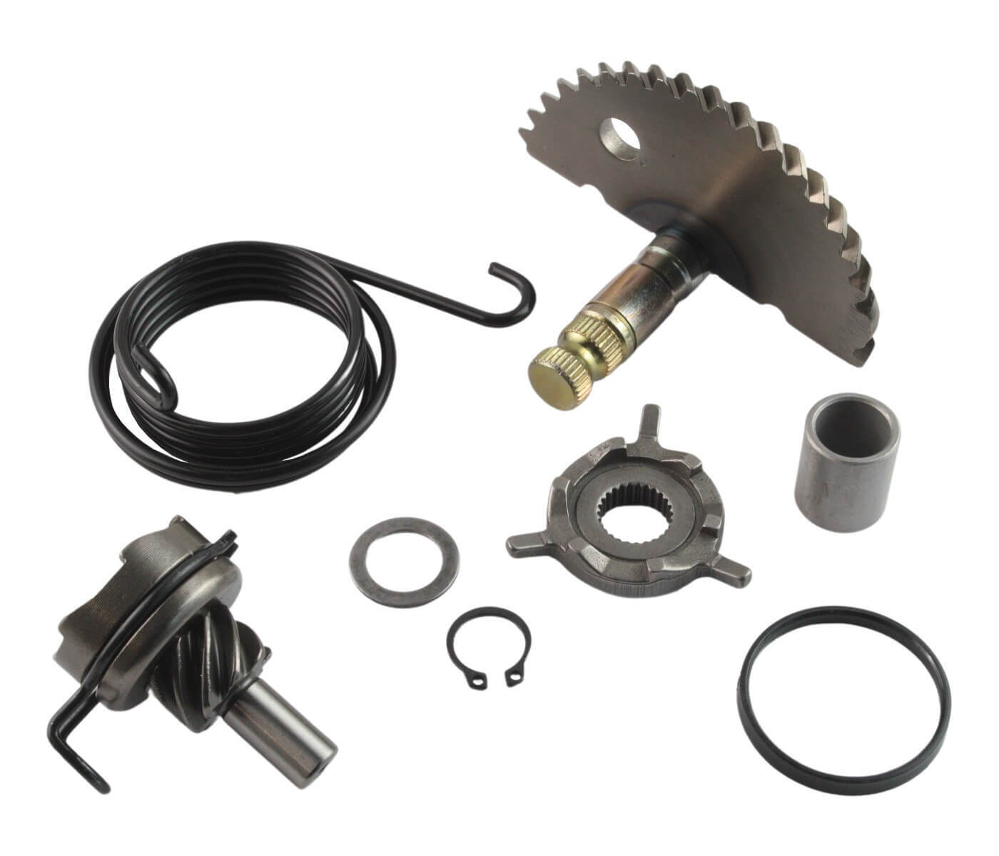 Dein Roller springt nicht mehr an? Dieses komplette Kickstarter-Reparatur-Set bringt deinen 50ccm 2-Takt Motor wieder zum Laufen! Enthält alles was du brauchst: Kickstarterwelle, -buchse, -ritzel, Spannfeder, Mitnehmer, Rückholfeder und klappbaren Hebel. Passt für Aprilia SR 50, Derbi Atlantis, Gilera Runner, Piaggio NRG, Sfera, TPH, Zip und viele mehr. Super wichtig wenn der E-Starter mal streikt. Hochwertige Ersatzteile für lange Haltbarkeit. Check vor dem Kauf die Kompatibilität mit deinem Modell und schon kann's losgehen!