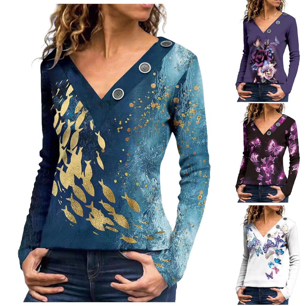 Damen Bluse 3/4 Arm V-Ausschnitt - Casual Shirt Mit Knopfleiste