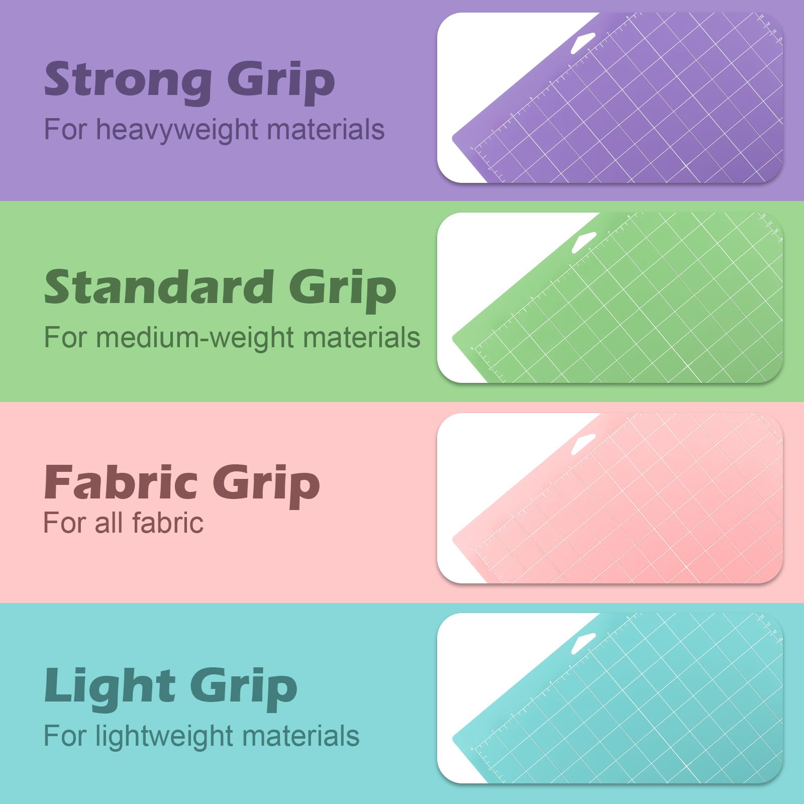 4 Schneidematten mit unterschiedlichen Haftstärken! Transparent, blau, lila und rosa - für jedes Projekt die richtige Matte. Größe: 12x12 Zoll.