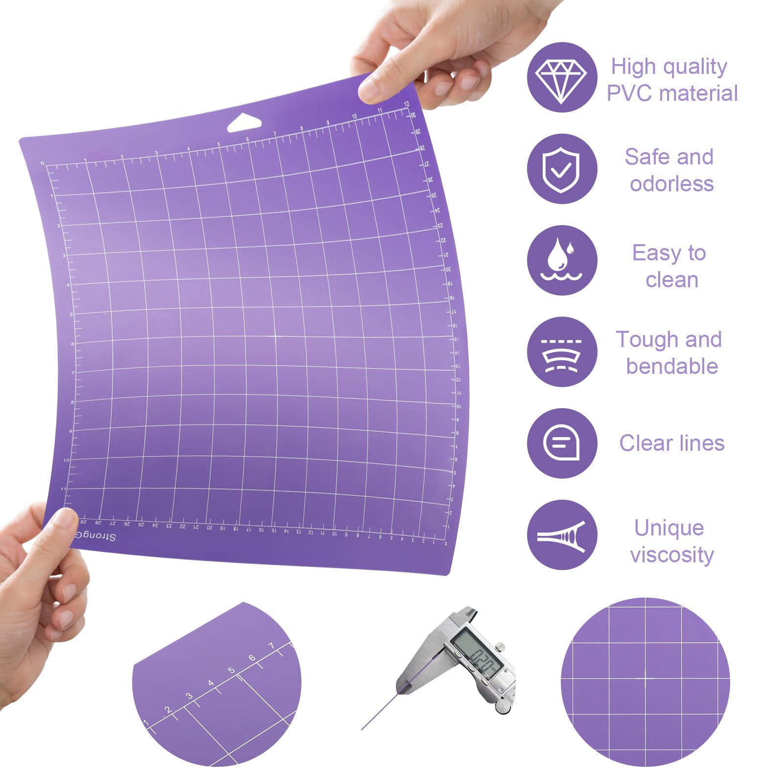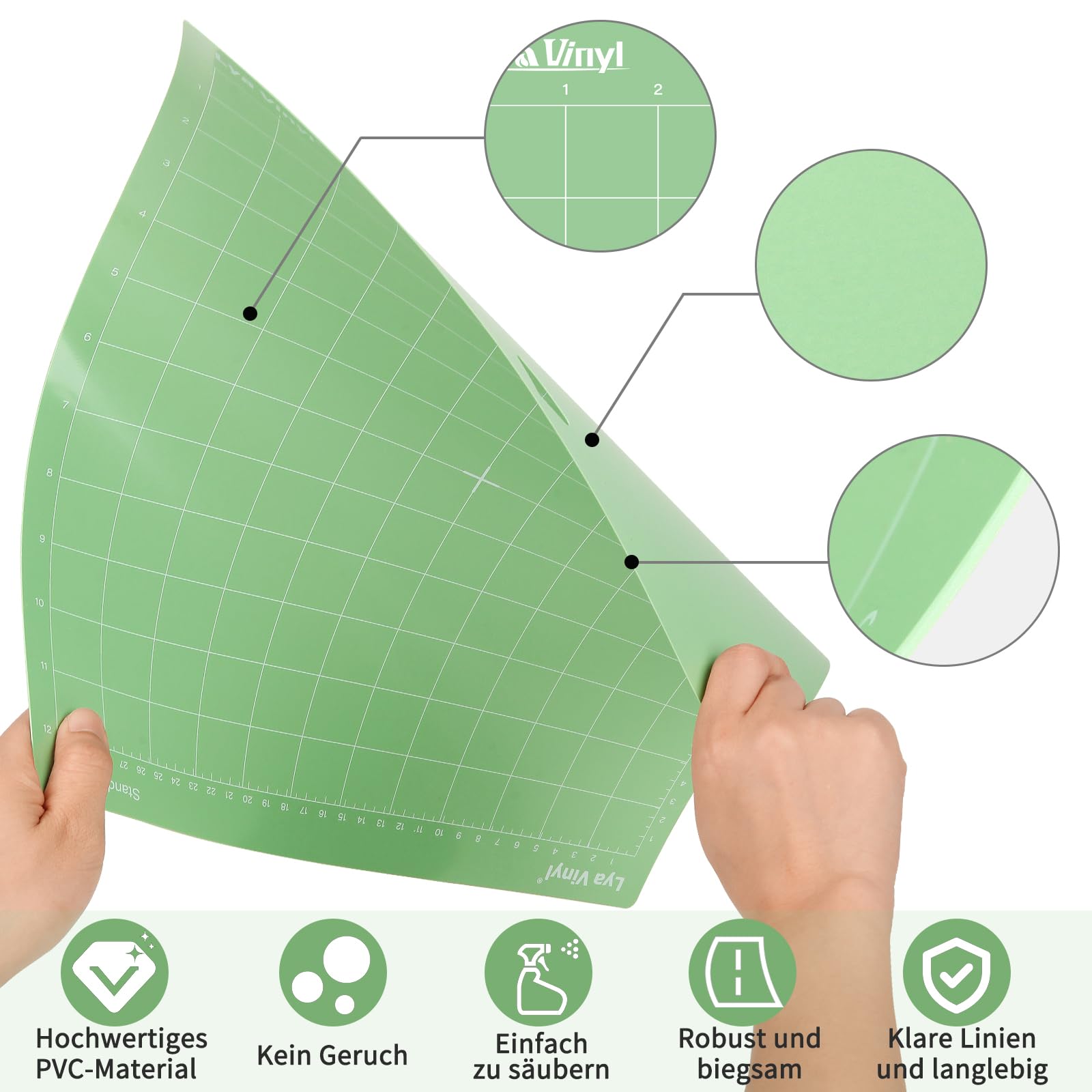 Aus hochwertigem PVC - langlebig und einfach zu reinigen. Präzise Rasterlinien für genaues Schneiden. Transparente Schutzfolie bewahrt Haftkraft.