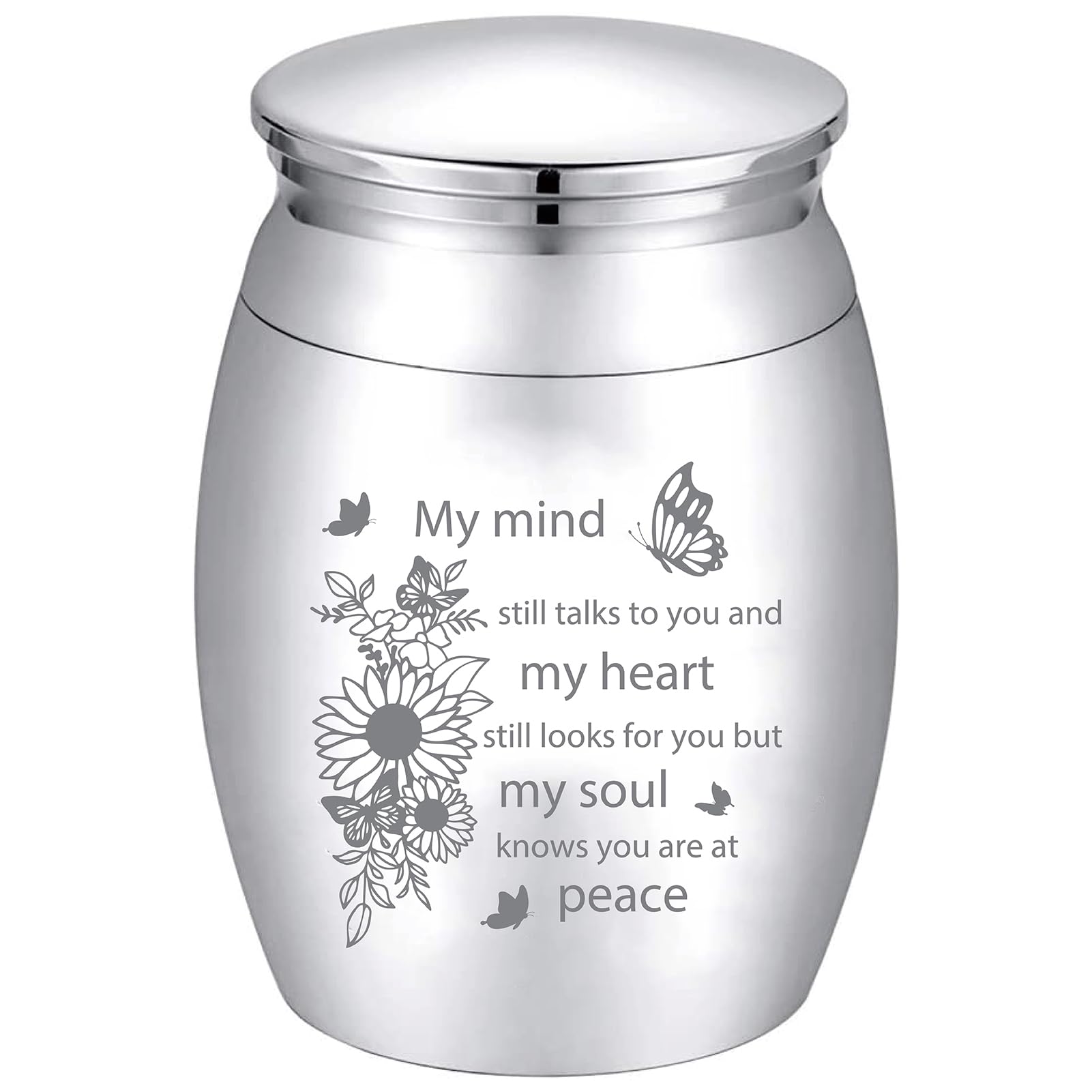 Für die ganz besonderen Erinnerungen... Diese zierliche Urne aus Aluminium ist perfekt, um einen kleinen Teil der Asche deines Lieblings bei dir zu tragen. Mit den Maßen 6,5x4,5 cm passt sie in jede Hand und ist doch groß genug, um Trost zu spenden. Die berührende Gravur 'Dein Flügel ist bereit, aber dein Herz ist nicht' drückt genau das aus, was man in so einem Moment fühlt. Der Schraubdeckel hält alles sicher verschlossen und der beiliegende Samtbeutel schützt die Urne vor Kratzern. Ein kleiner Plastiklöffel hilft beim Befüllen. Ob für Mama, Papa, Oma, Opa oder ein geliebtes Haustier - damit bleibt dein Liebling immer bei dir. Ein tröstliches Andenken in schwierigen Zeiten.