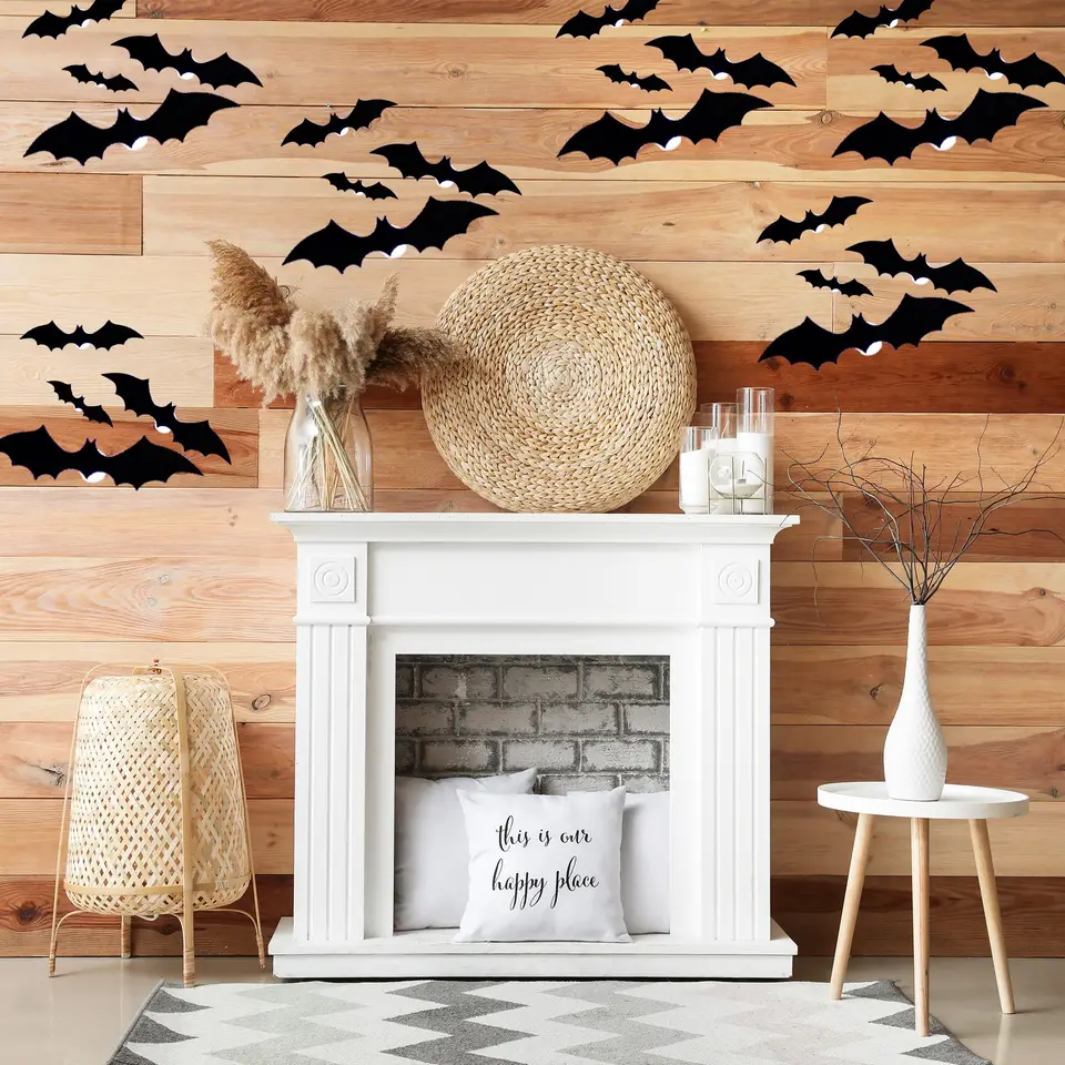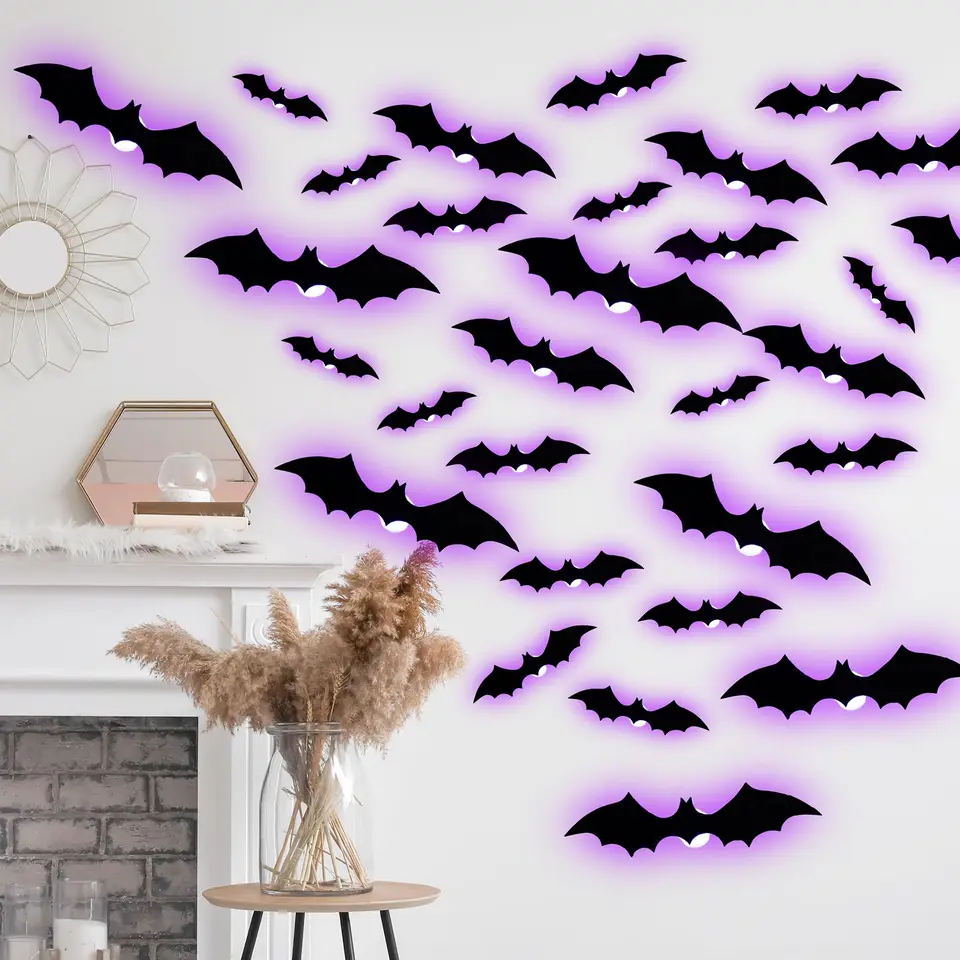 Boo! Mach dein Zuhause zur gruseligen Halloween-Höhle mit diesen mega-coolen 3D-Fledermäusen von AstraGlam! 48 Stück mit leuchtenden Augen - das gibt richtig was her für deine Halloween-Party. Einfach die Schutzfolie abziehen und an Wände, Fenster oder Türen kleben - die Dinger halten bombenfest, lassen sich aber rückstandslos wieder entfernen. Aus robustem, wetterfestem PVC, also perfekt für drinnen und draußen. Ob an der Haustür, im Wohnzimmer oder Bad - überall sorgen sie für den perfekten Gruselfaktor. Und das Beste: Du kannst sie nach der Party einfach abmachen und für nächstes Jahr aufbewahren! Umweltfreundlich und wiederverwendbar - so macht Halloween Spaß ohne großen Aufwand. Einfach bestellen, aufkleben und deine Gäste erschrecken - die leuchtenden Augen sind der absolute Hingucker!