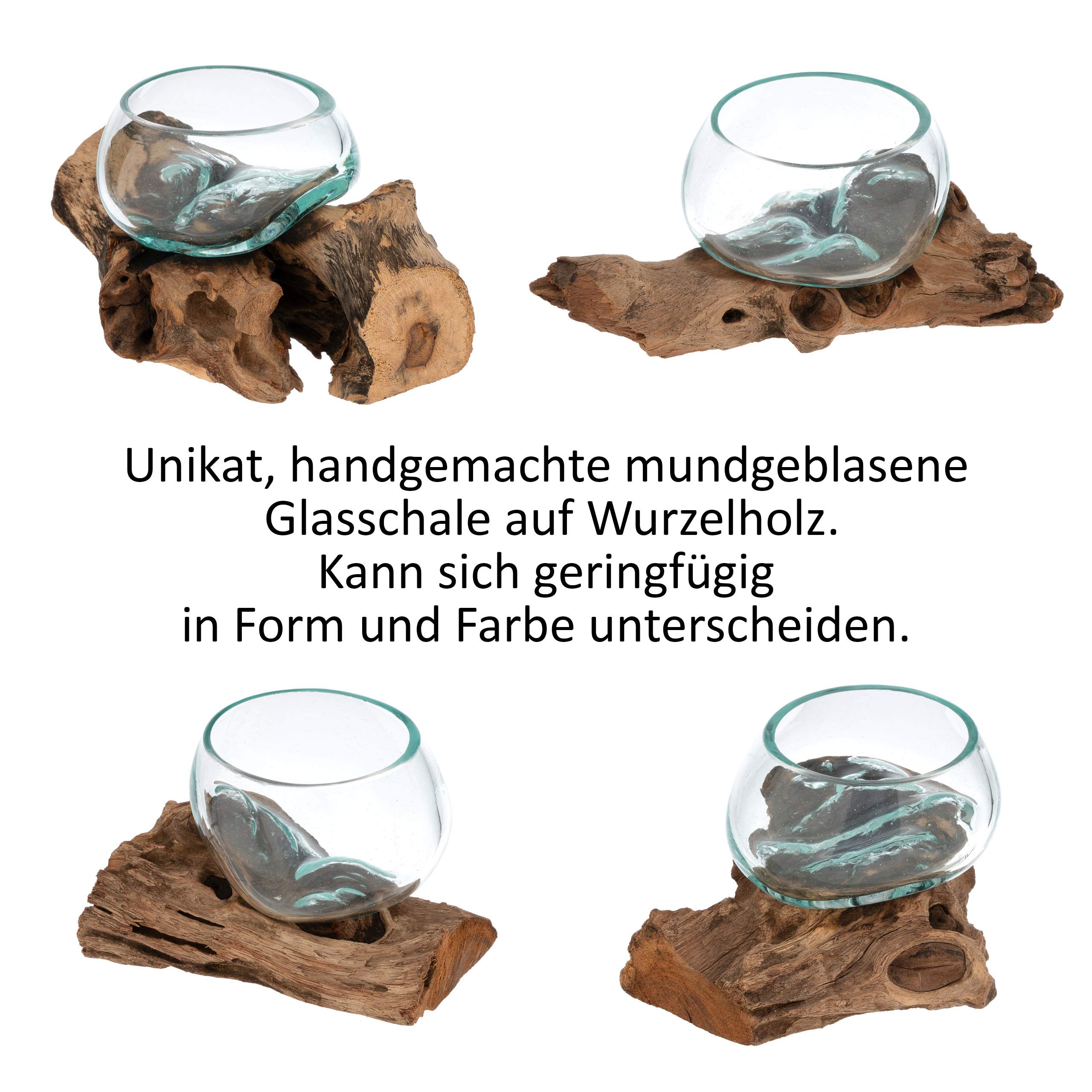 Diese mundgeblasene Glasschale auf Treibholz ist einfach nur wow! Jedes Stück ist ein absolutes Unikat - handgefertigt in Deutschland von ART-CRAFT. Das mundgeblasene Glas trifft auf natürliches Treibholz und erschafft so ein einzigartiges Kunstobjekt. Mit ca. 10x10x7 cm ist sie perfekt für den Couchtisch, Sideboard oder Regal. Du kannst sie als Schmuckschale nutzen, als stylischen Kerzenhalter oder einfach als Deko-Objekt das immer Blickfang ist. Das Tolle: Jedes Treibholz-Stück ist anders - deine Schale ist also wirklich einmalig! Die natürliche Optik passt zu fast jedem Einrichtungsstil - ob modern, skandinavisch, Boho oder maritim. Einfach ein zeitloses Design das immer geht. Zur Lieferung gehört sogar ein Echtheitszertifikat - so weißt du dass du ein richtiges Kunsthandwerk-Stück bekommst. Pflege ist einfach: Glasschale mit warmem Wasser reinigen, das Treibholz trocken abstauben. Perfekt als Geschenk für Design-Liebhaber oder um dein Zuhause aufzuwerten. Nachhaltig gefertigt aus recyceltem Treibholz und hochwertigem Glas - gut für's Gewissen und gut für's Auge! Hol dir dieses besondere Stück Natur und Handwerkskunst in dein Zuhause - es wird garantiert zum Gesprächsthema!