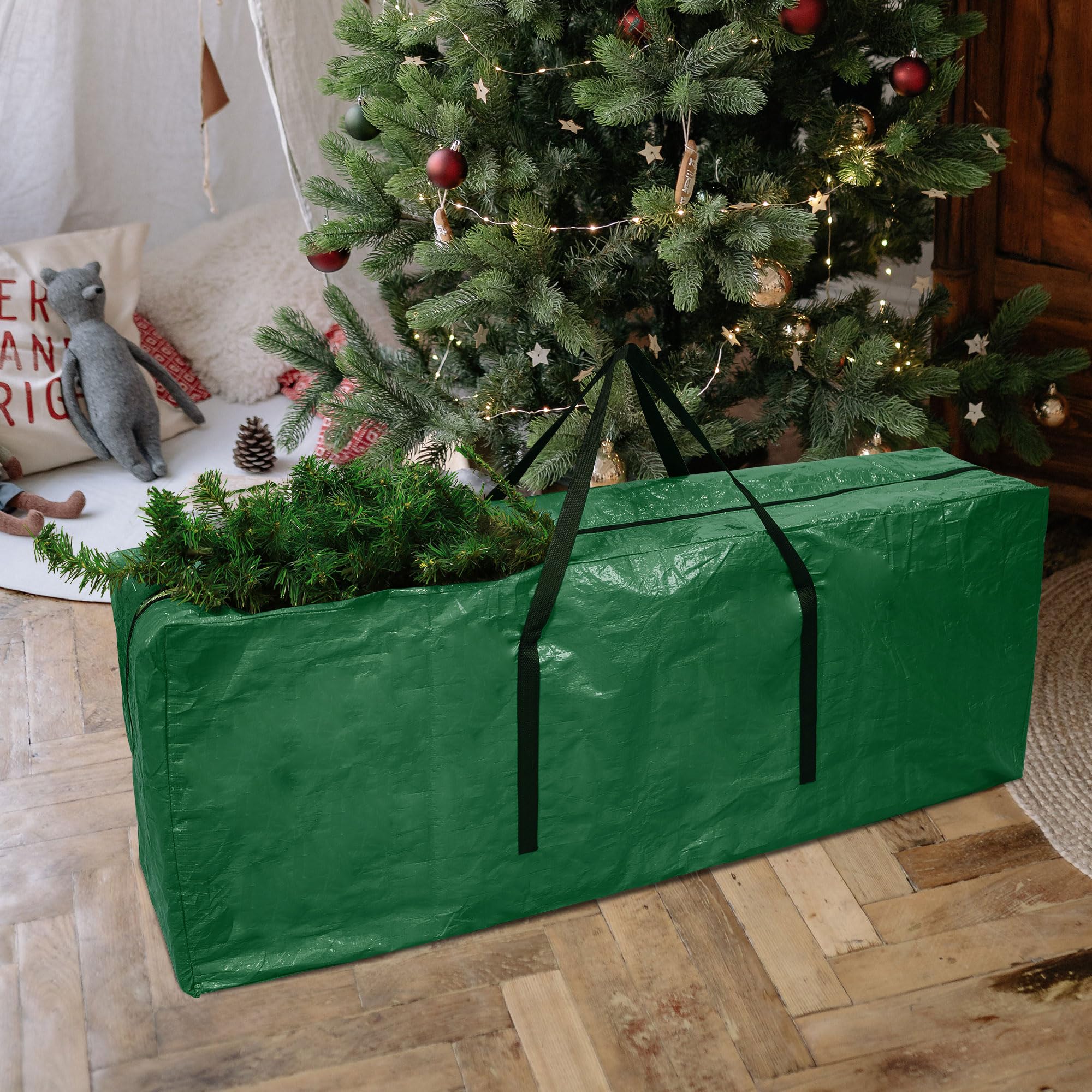 Endlich Ordnung nach Weihnachten! Diese praktische Aufbewahrungstasche von Funshot bewahrt deinen künstlichen Weihnachtsbaum sicher bis zur nächsten Saison auf. Groß genug für Bäume bis zu 7,5ft (2,3m) - mit Maßen von 120x25x45cm. Aus extrem strapazierfähigem, wasserdichtem Polyethylen-Kunststoff - schützt zuverlässig vor Staub, Feuchtigkeit und lästigen Schädlingen. Der lange Reißverschluss oben macht das Ein- und Auspacken super einfach. Die verstärkten Tragegriffe erleichtern den Transport. Stabil vernäht und reißfest - hält jahrelang. Einfach mit feuchtem Tuch reinigen und platzsparend verstauen - unter dem Bett oder im Schrank. Nicht nur für Weihnachtsbäume geeignet, sondern auch für saisonale Kleidung, aufblasbare Dekoration oder Gartenschmuck. In grün erhältlich - praktisch, robust und genau das Richtige für alle, die ihre Weihnachtsdekoration ordentlich verstauen wollen. Mach das lästige Aufräumen zur leichten Aufgabe!